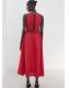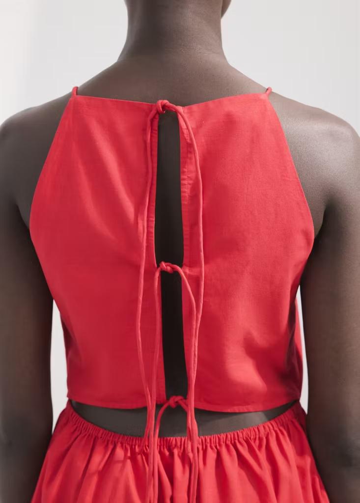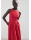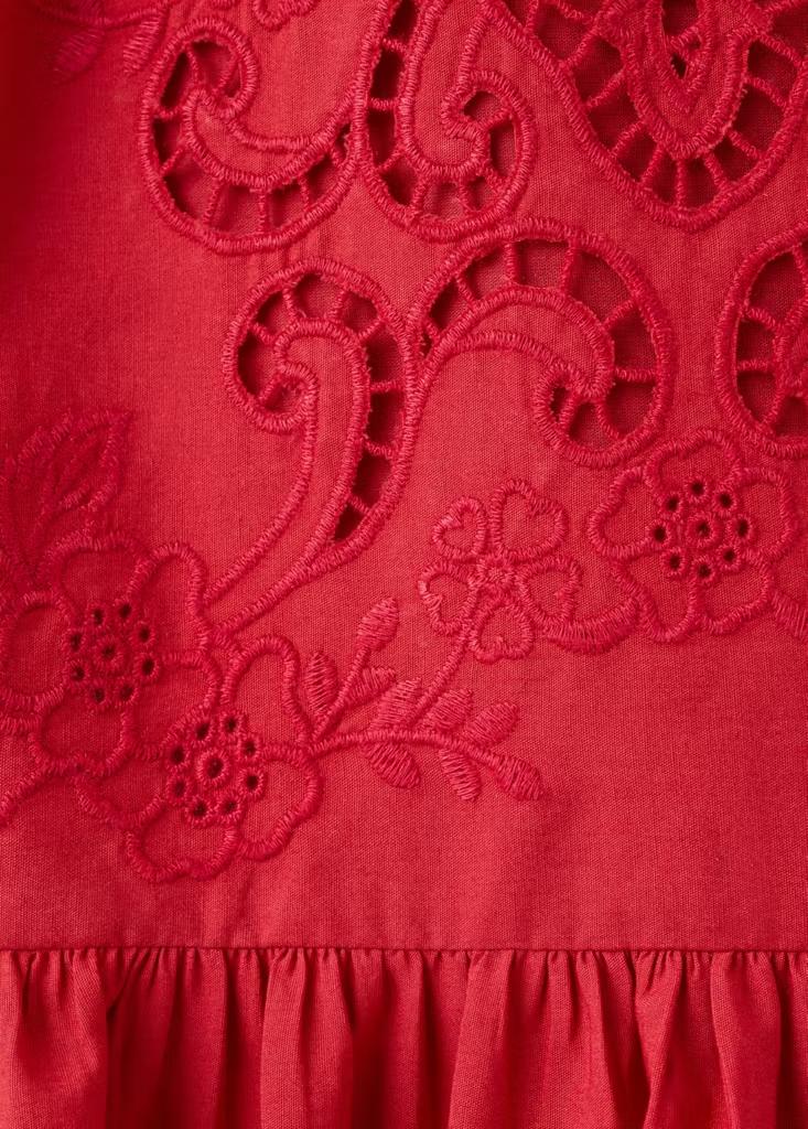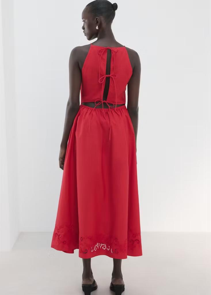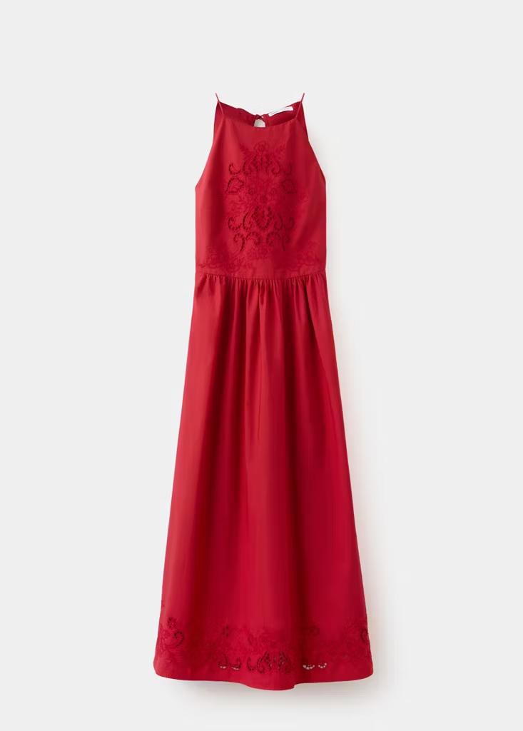 Tejido 100% algodón. Diseño evasé. Diseño largo. Detalles bordados calados. Cuello halter. Sin mangas. Cierre de lazo en la espalda. Forro interior. Exclusivo Online