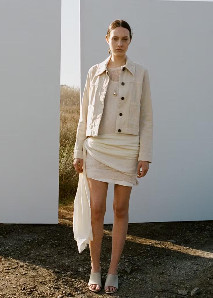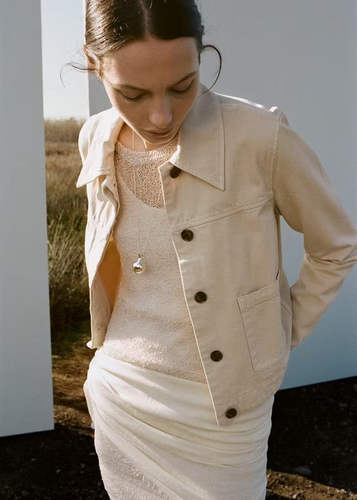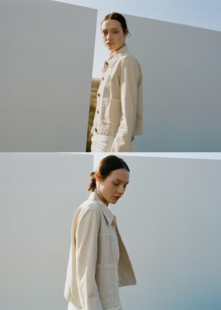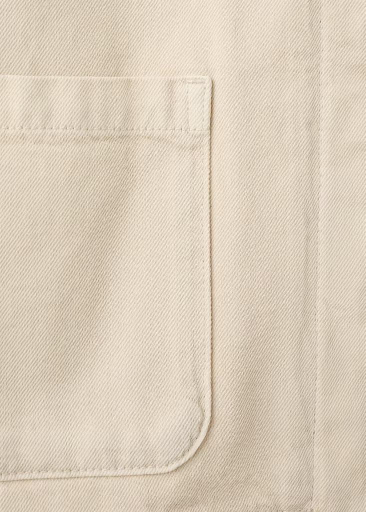 Tejido de algodón estilo tejano vaquero. Cuello camisero. Manga larga. Dos bolsillos de parche en la parte delantera. Cierre delantero de botones oculto