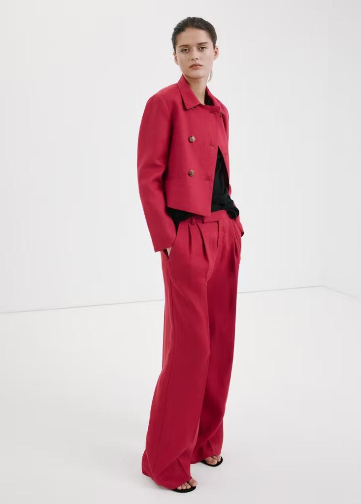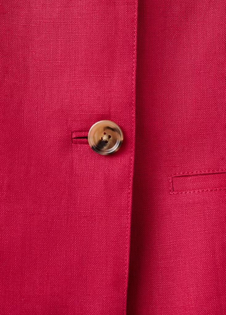 Tejido 100% lino. Diseño recto. Cuello camisero. Manga larga. Dos bolsillos de ribete laterales. Cierre de doble botonadura. Total look