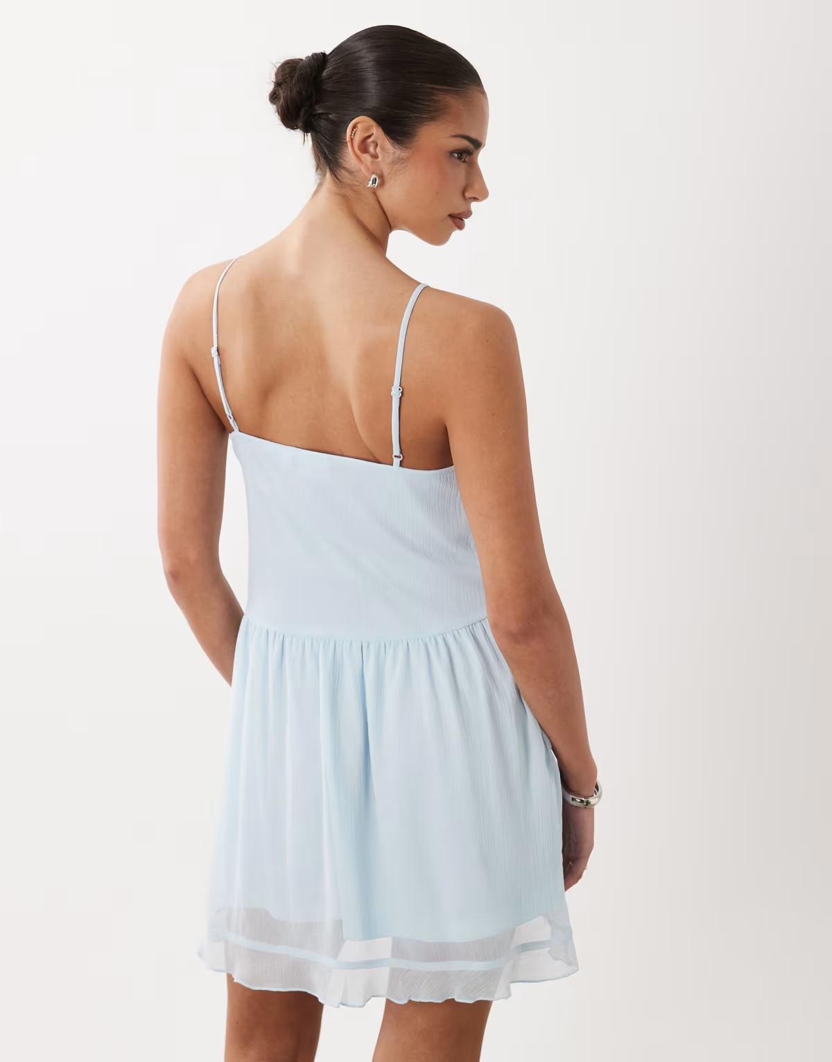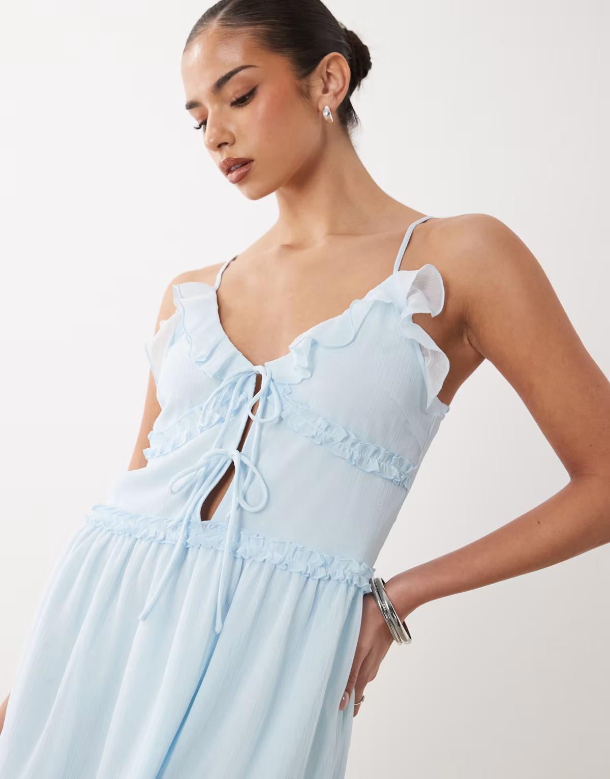 Vila tie front cami mini dress with frill trim in pastel blue