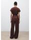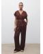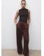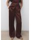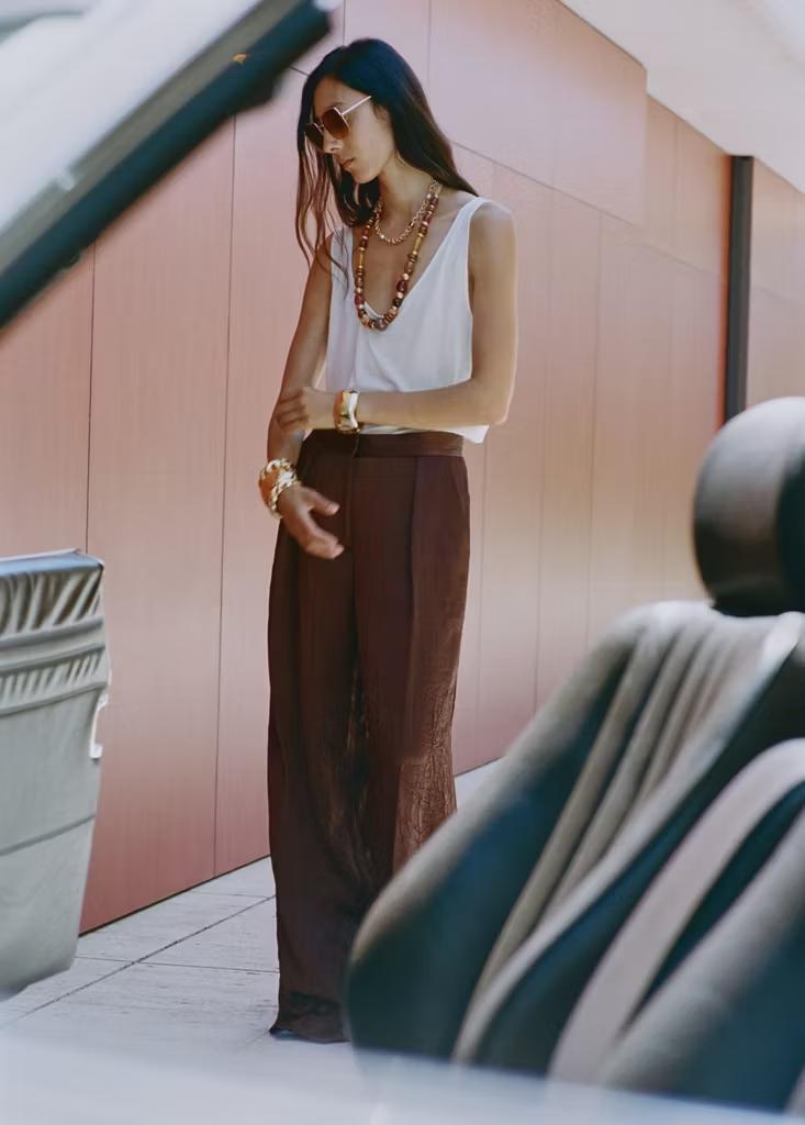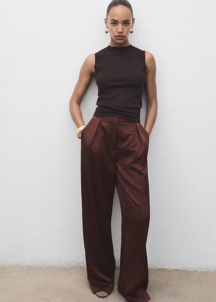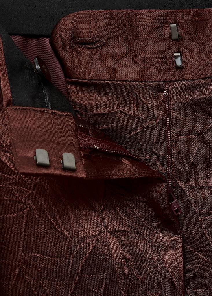 Tejido satinado. Efecto arrugado. Diseño recto. Tiro medio. Dos bolsillos laterales. Detalle de pinzas delanteras. Cierre oculto de botón, gancho y cremallera. Forro interior. Total look