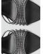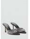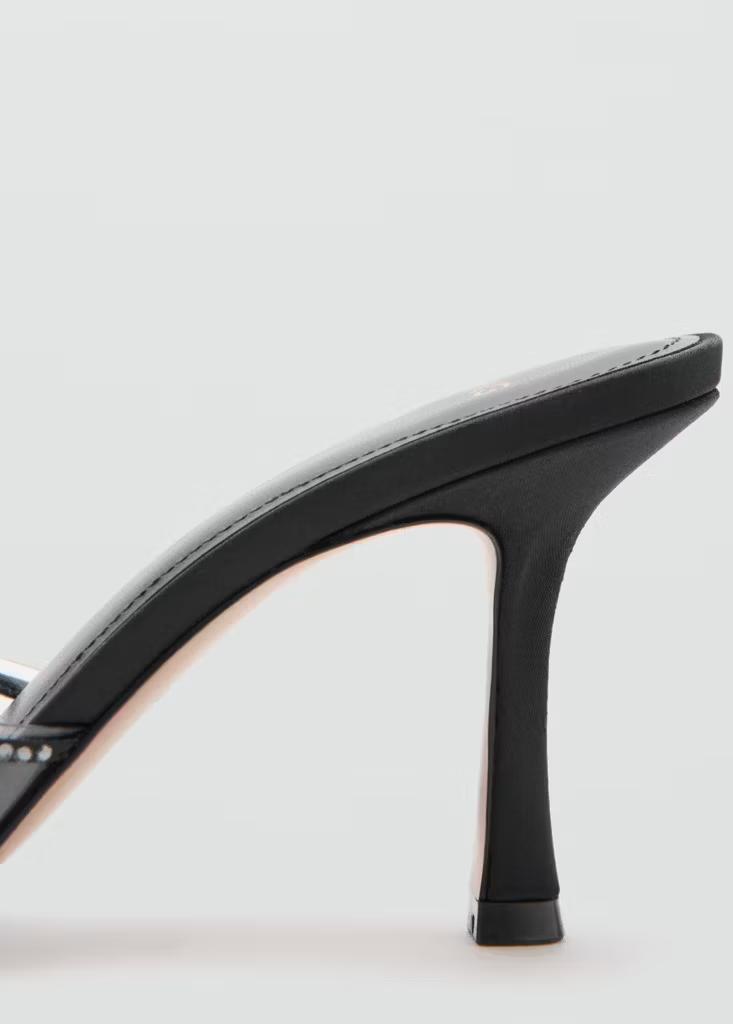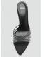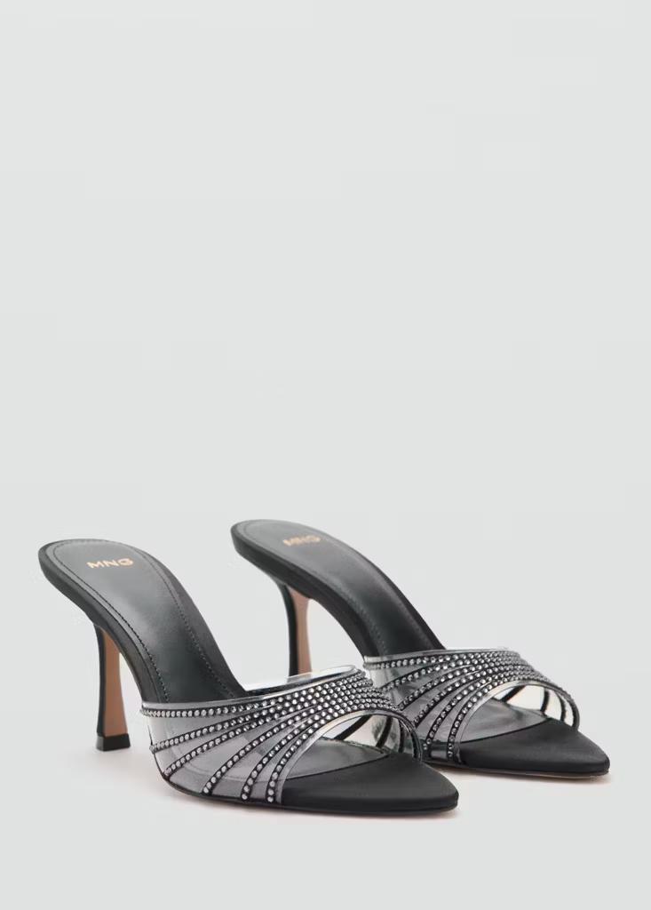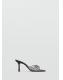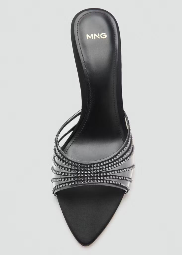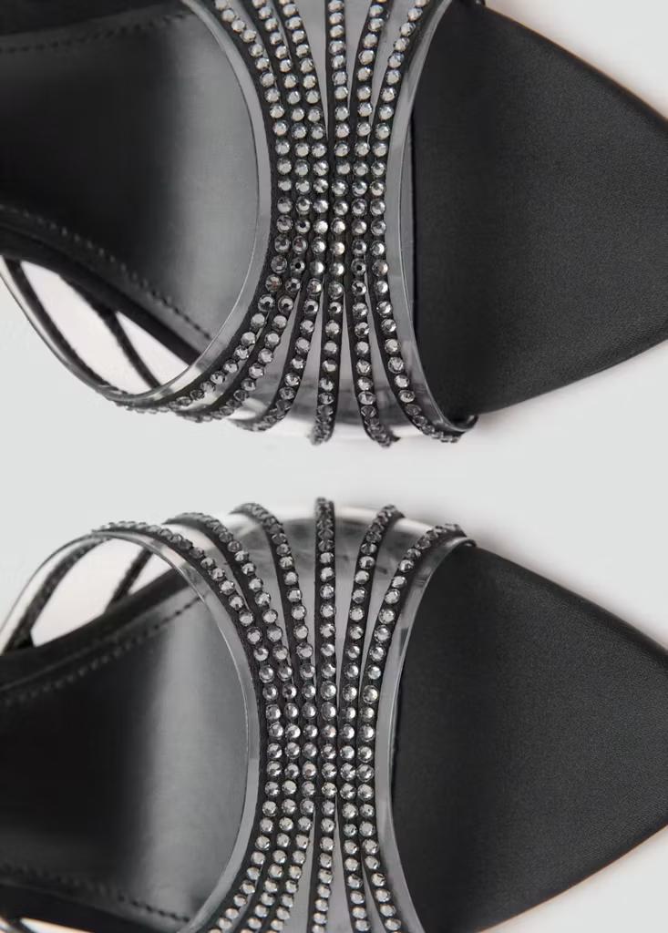 Diseño de tiras. Diseño destalonado. Diseño brillo. Detalle de strass. Puntera abierta. Tacón de aguja. El tacón mide 8 cm