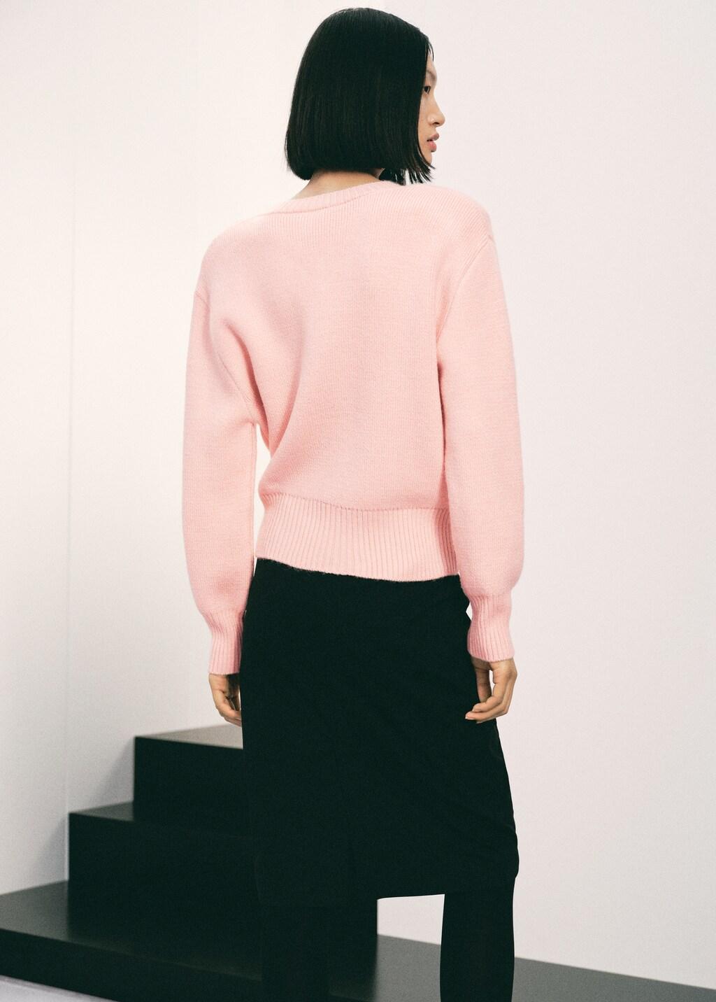 Confeccionado en tejido de punto medio, este diseño recto presenta cuello pico y manga larga
