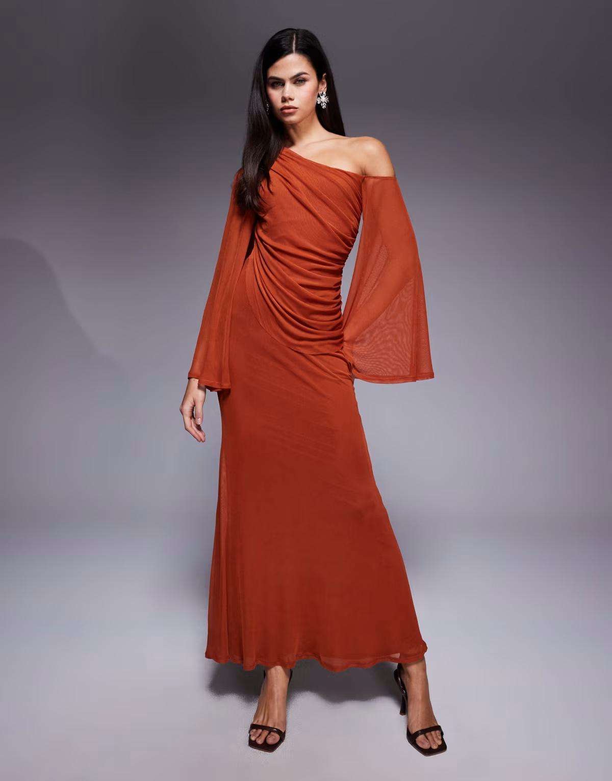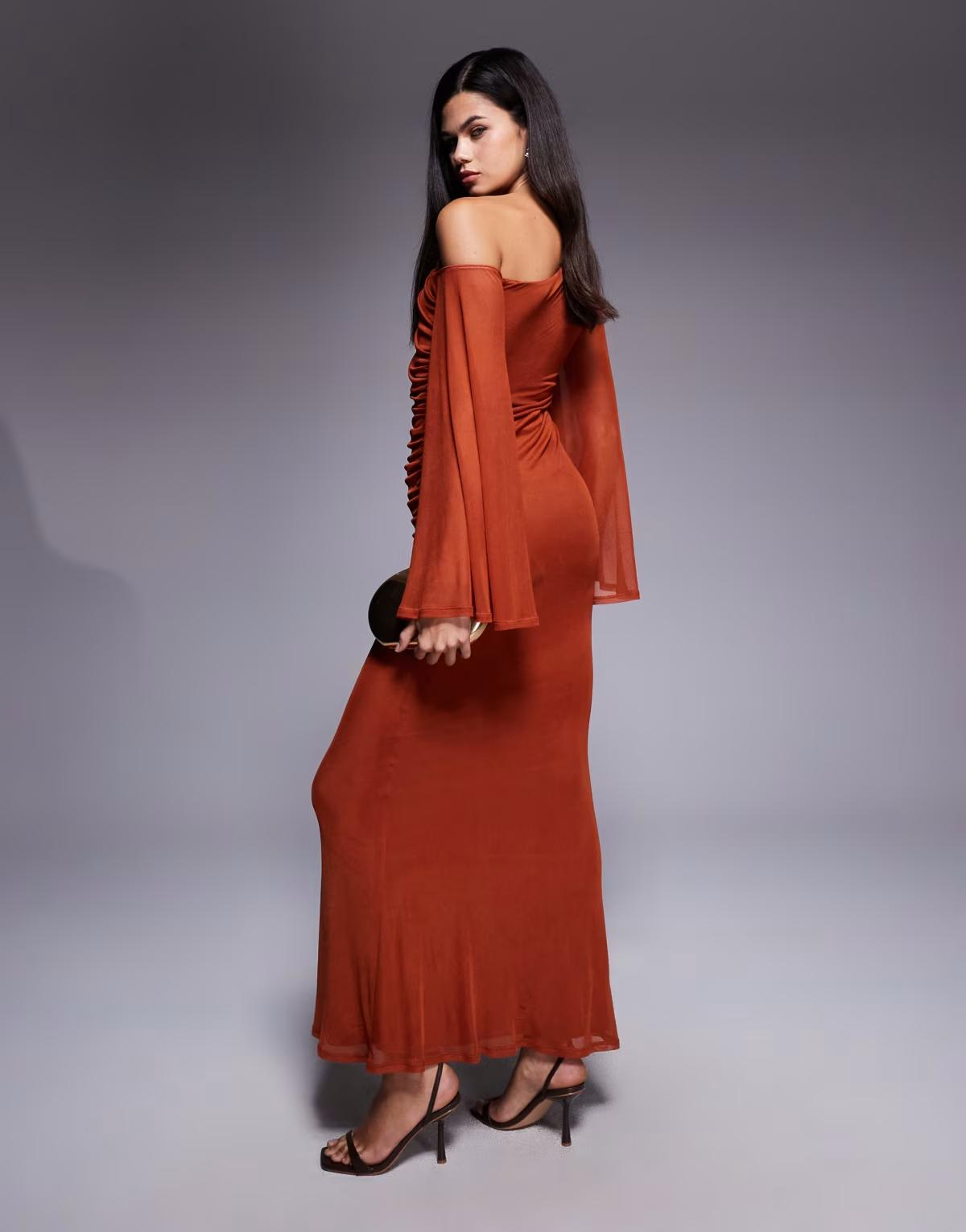 ASOS DESIGN off shoulder wide sleeve draped maxi dress in rust