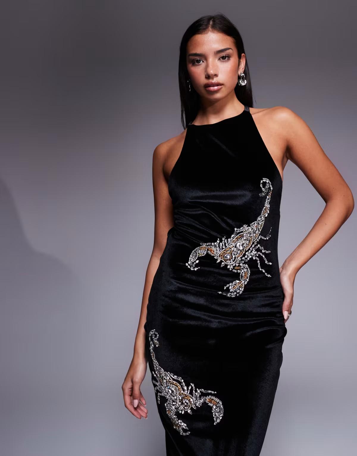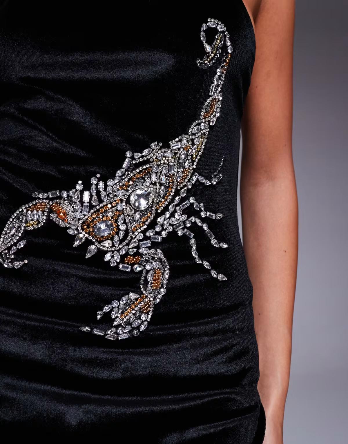 ASOS DESIGN velvet midi dress with scorpion embellishment
