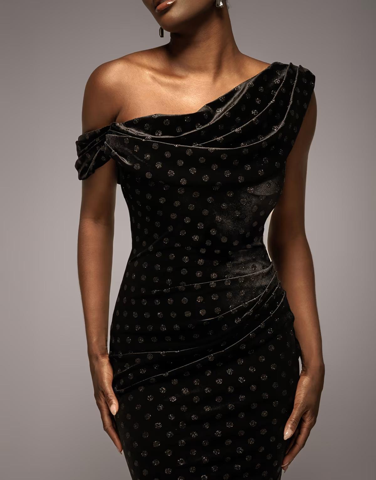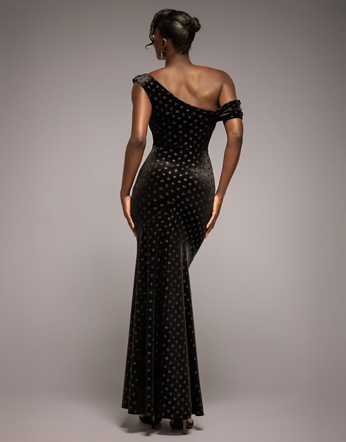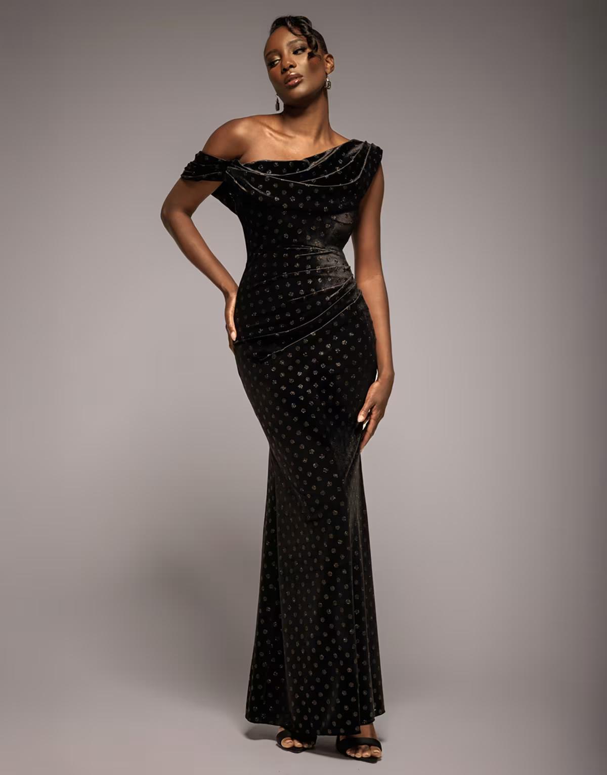 Goddiva Glitter velvet cowl neck off the shoulder maxi dress in black