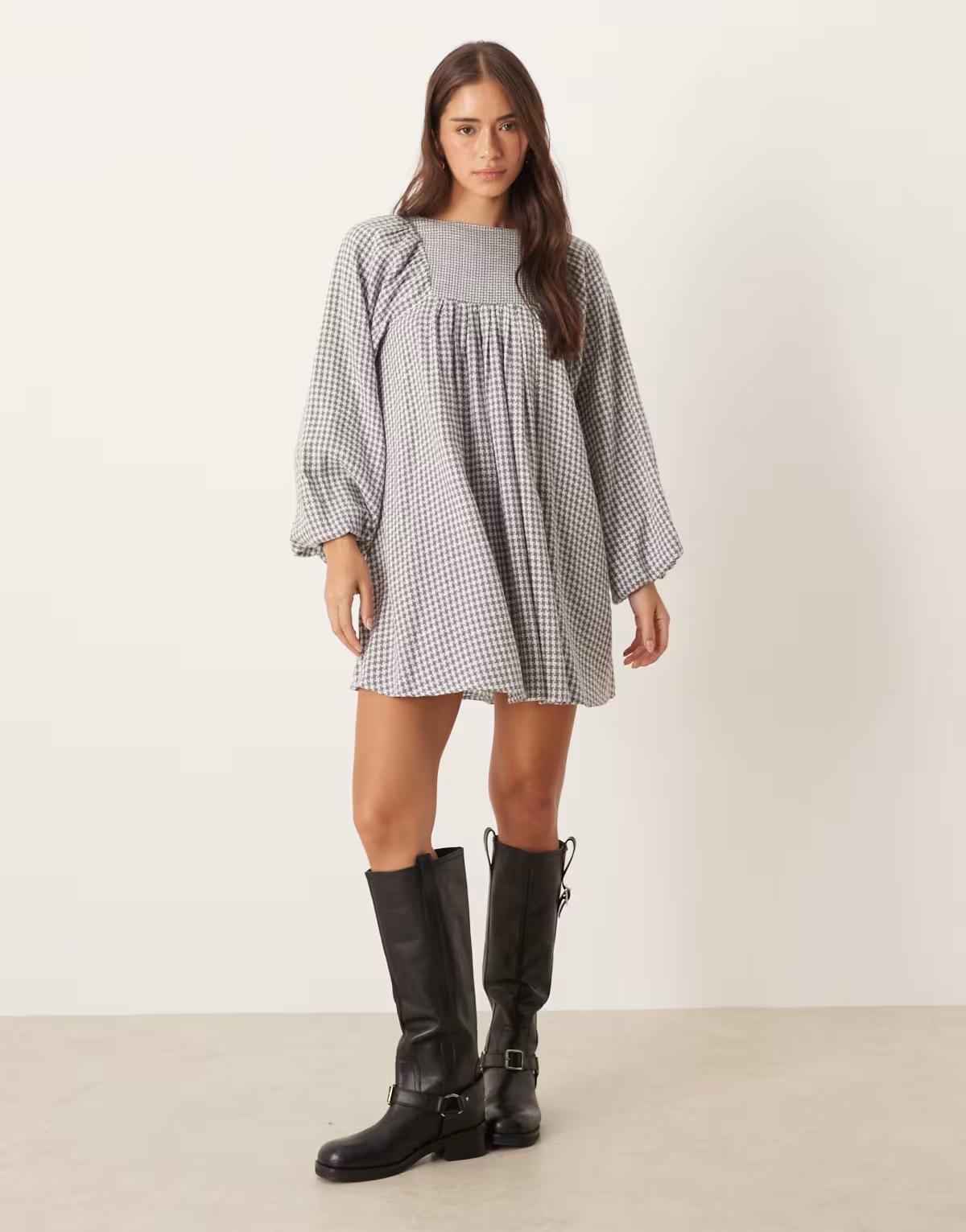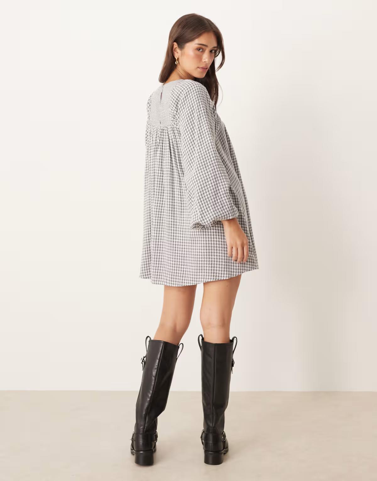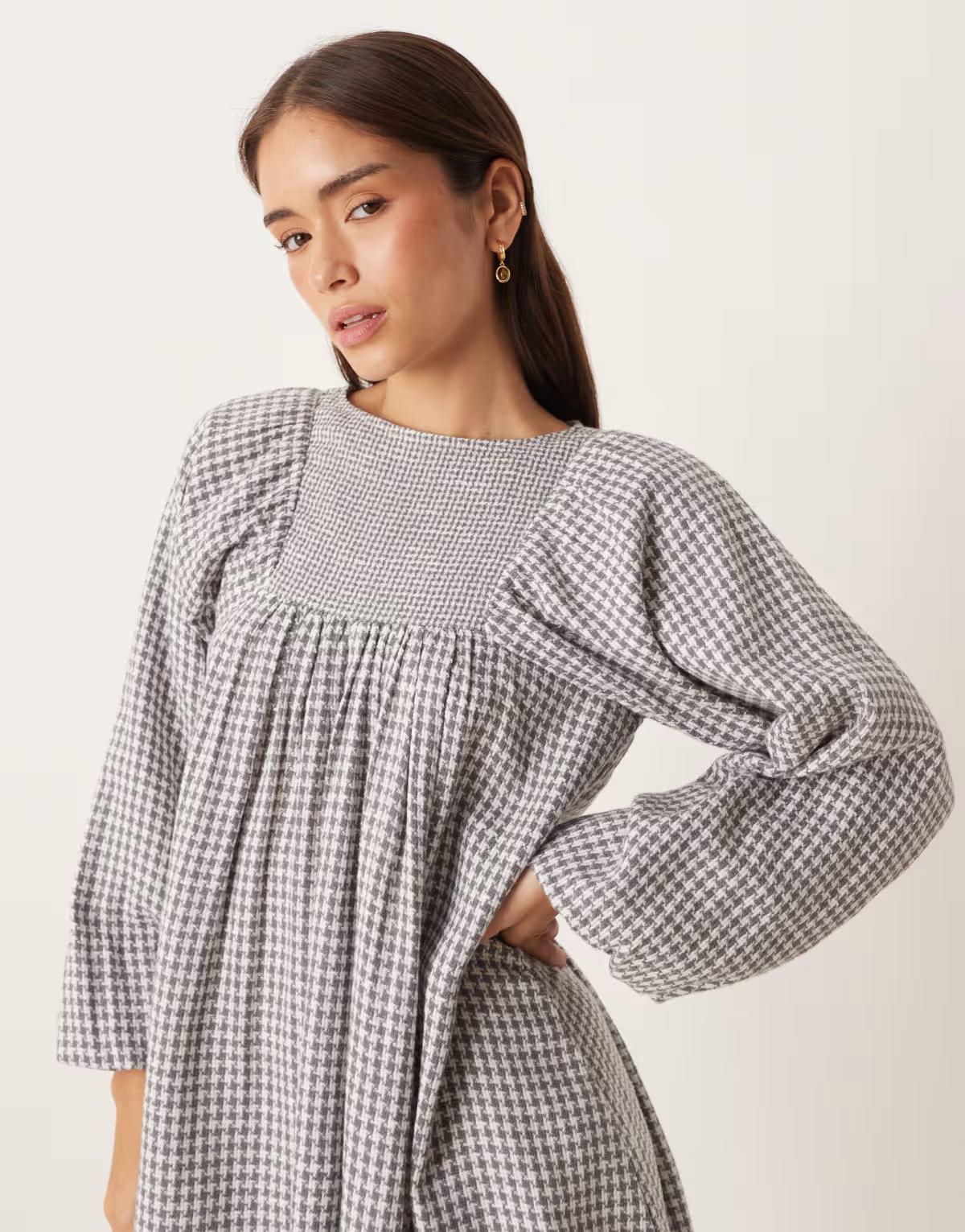 ASOS DESIGN boucle baby doll mini dress with volume sleeve in grey houndstooth