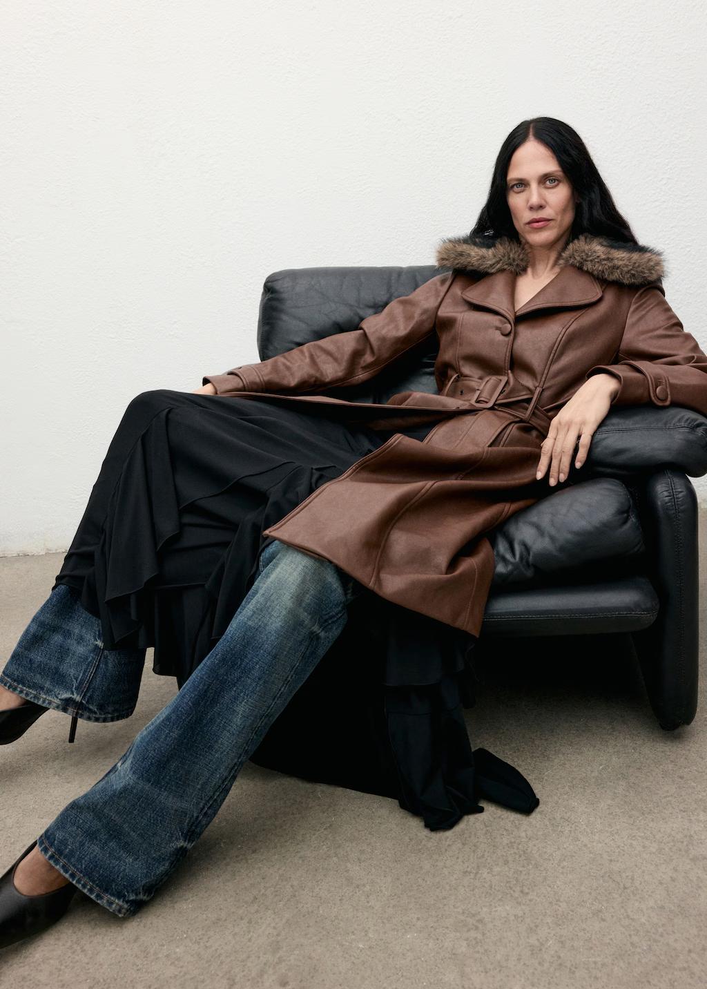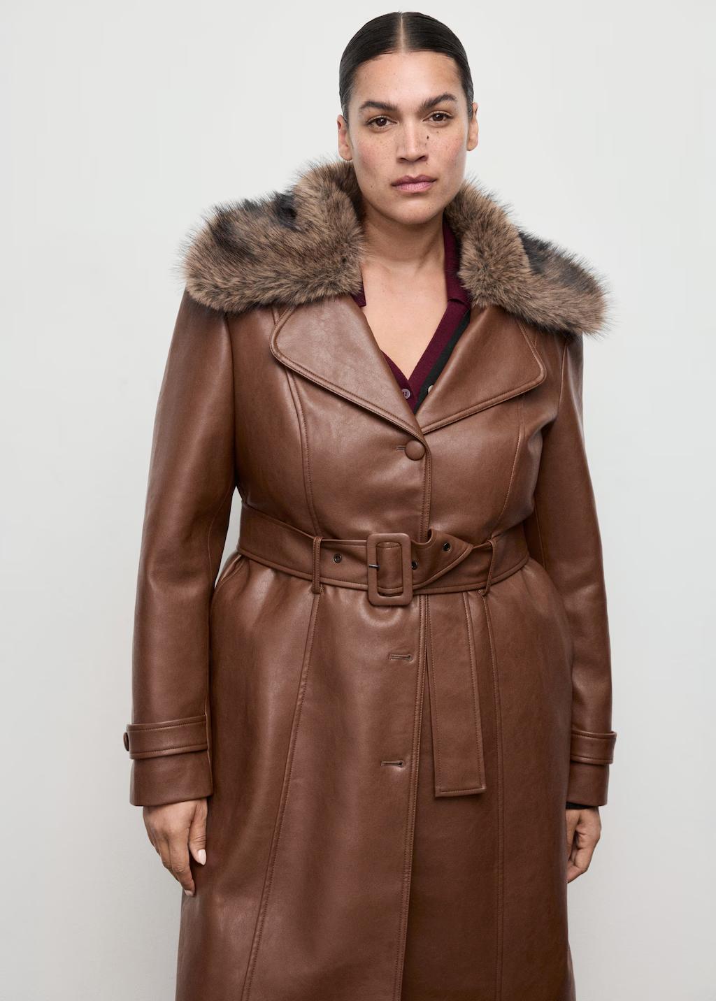 Esta prenda pertenece a nuestra colección de fiesta y evento, diseñada para elevar tus looks en ocasiones especiales. Confeccionado en tejido de polipiel, este diseño largo y recto presenta un cuello pico con solapa y pelo extraíble. Incluye manga larga, trabillas, cinturón con cierre de hebilla, dos bolsillos laterales y cierre delantero con botones. Disponible en tallas Plus