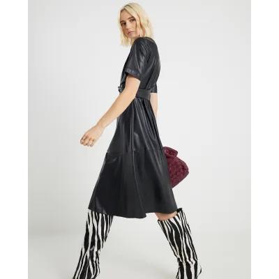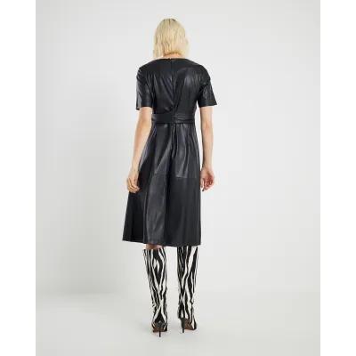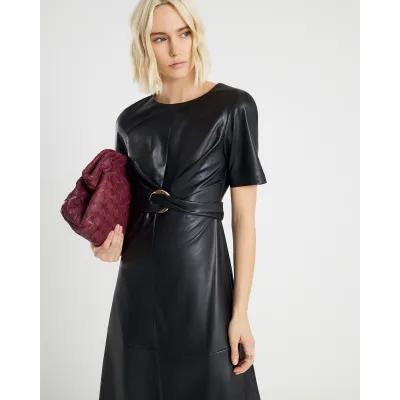 Black Faux Leather Buckle Detail Swing Dress