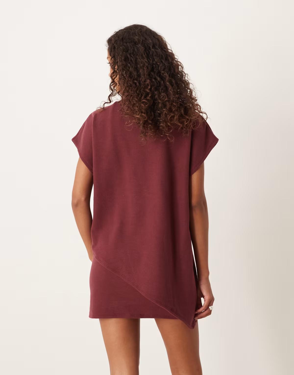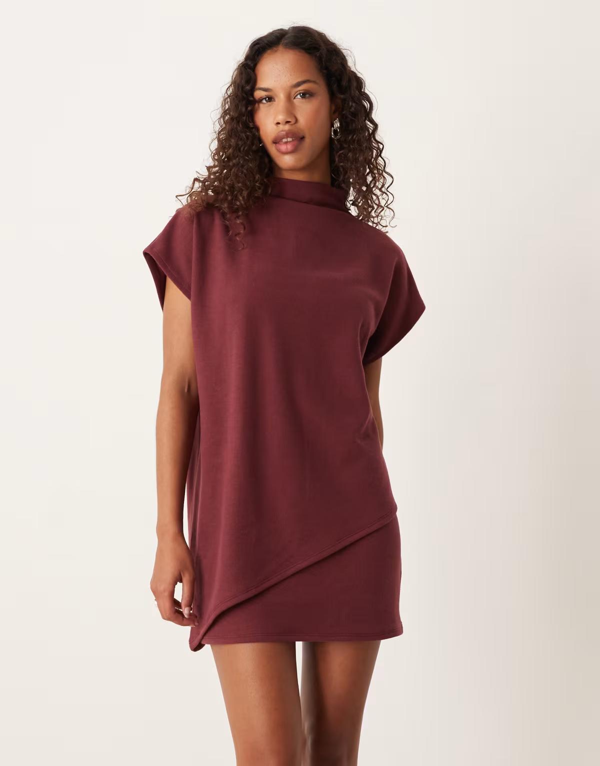 ASOS DESIGN supersoft sleeveless cape double layer mini dress in burgundy