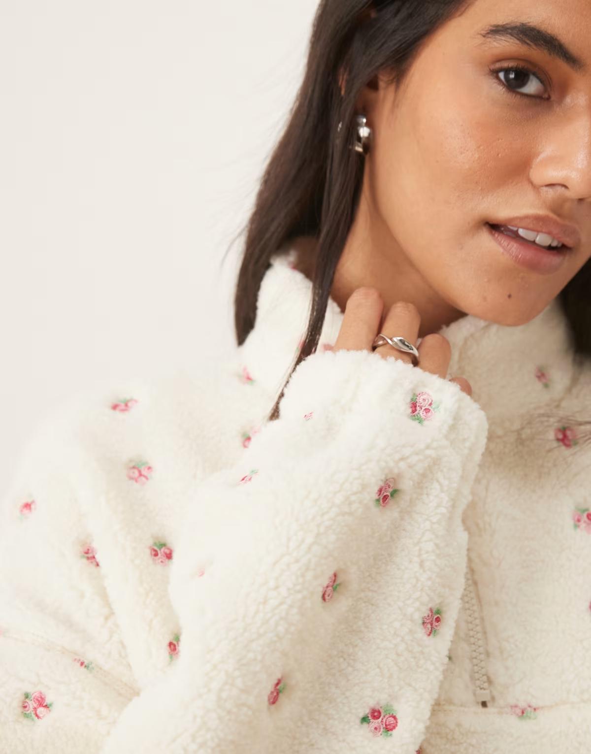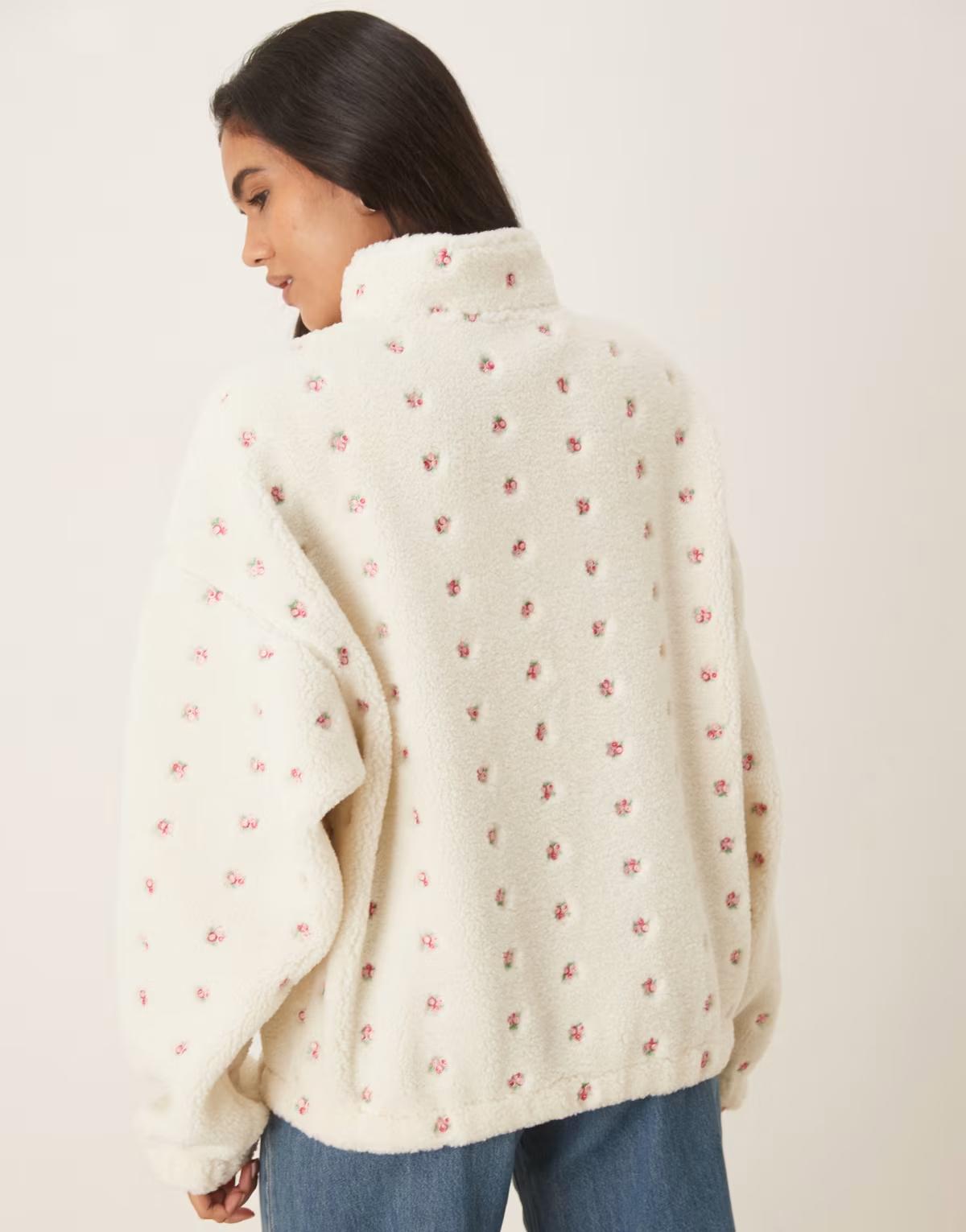 ASOS DESIGN borg zip through fleece with embroidered flower detail in cream