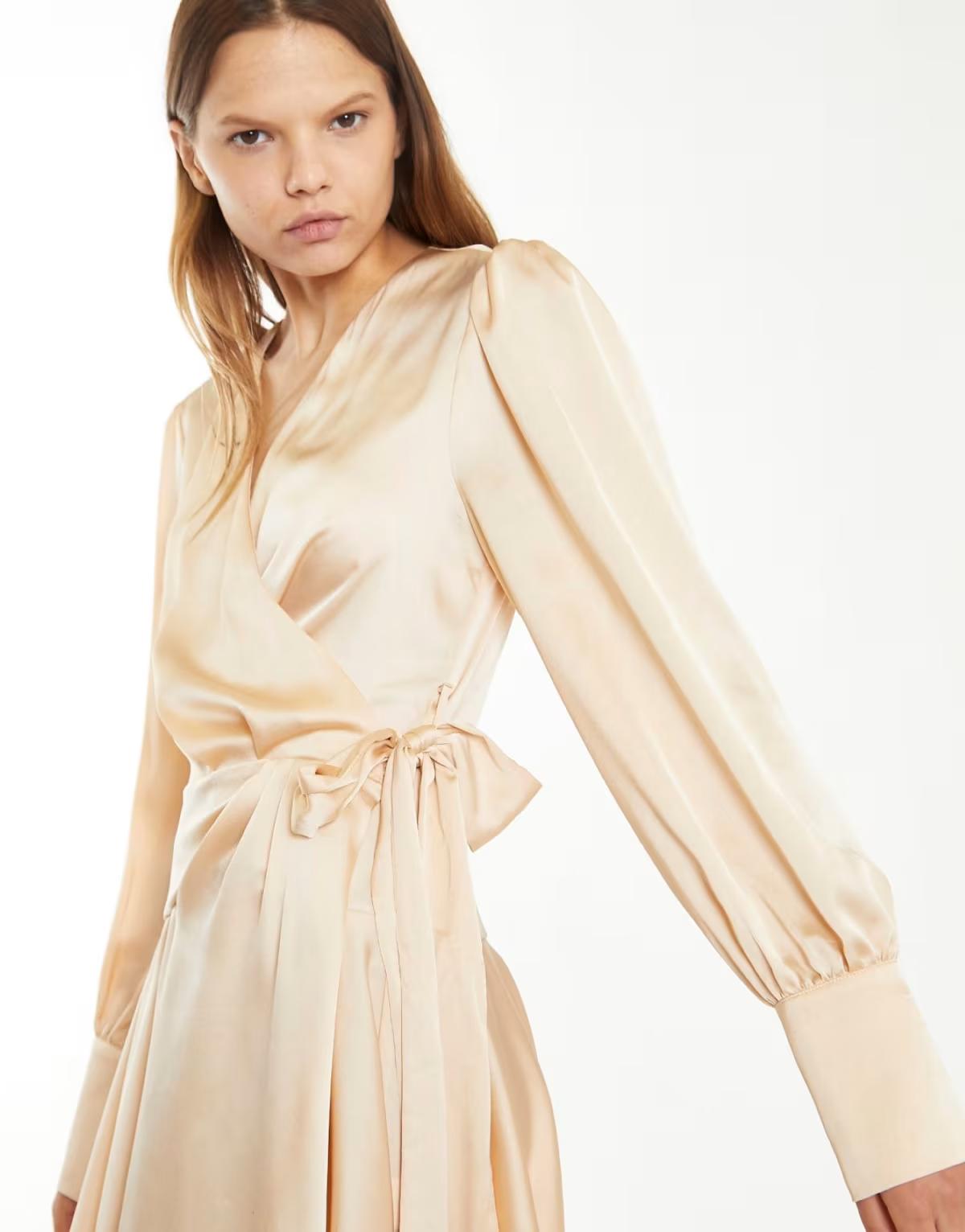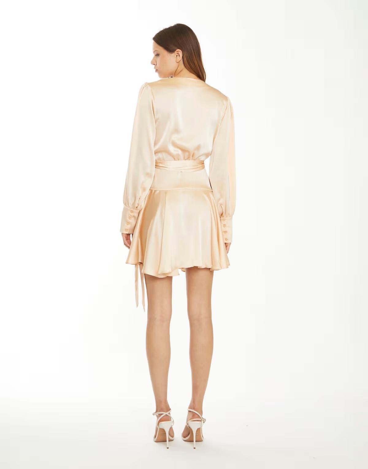 Narrated Wrap mini dress with puff long sleeves in peach sateen