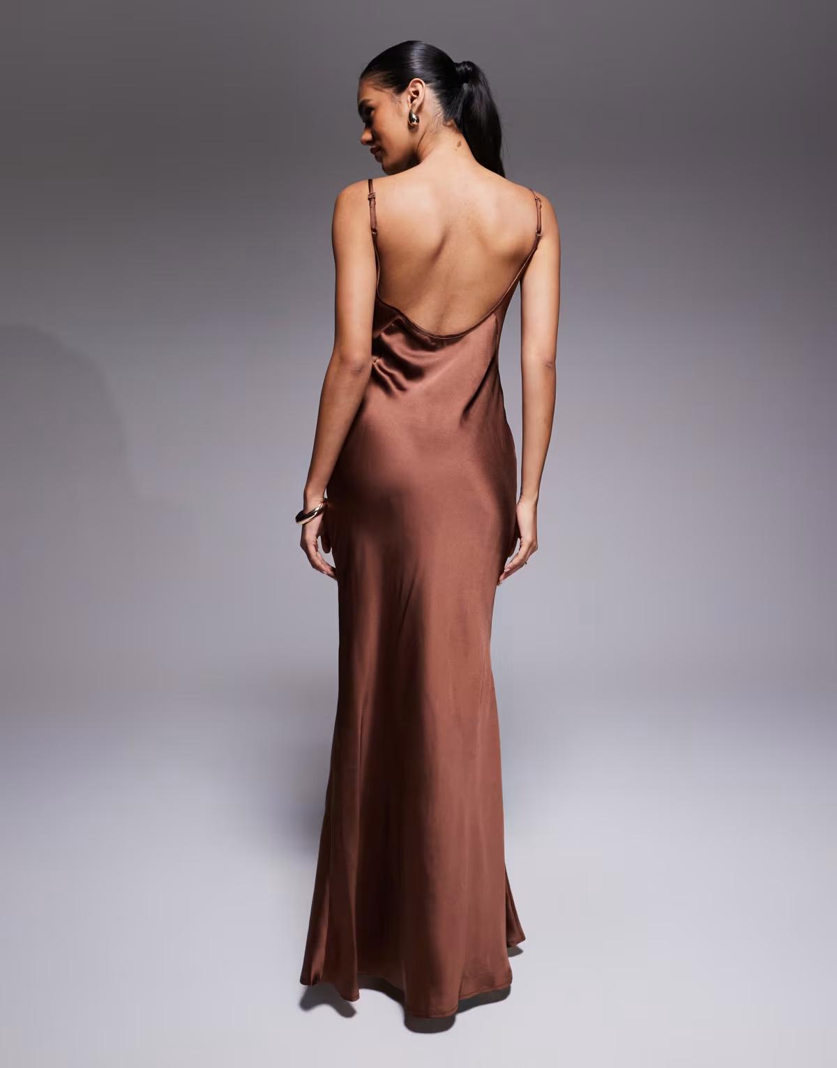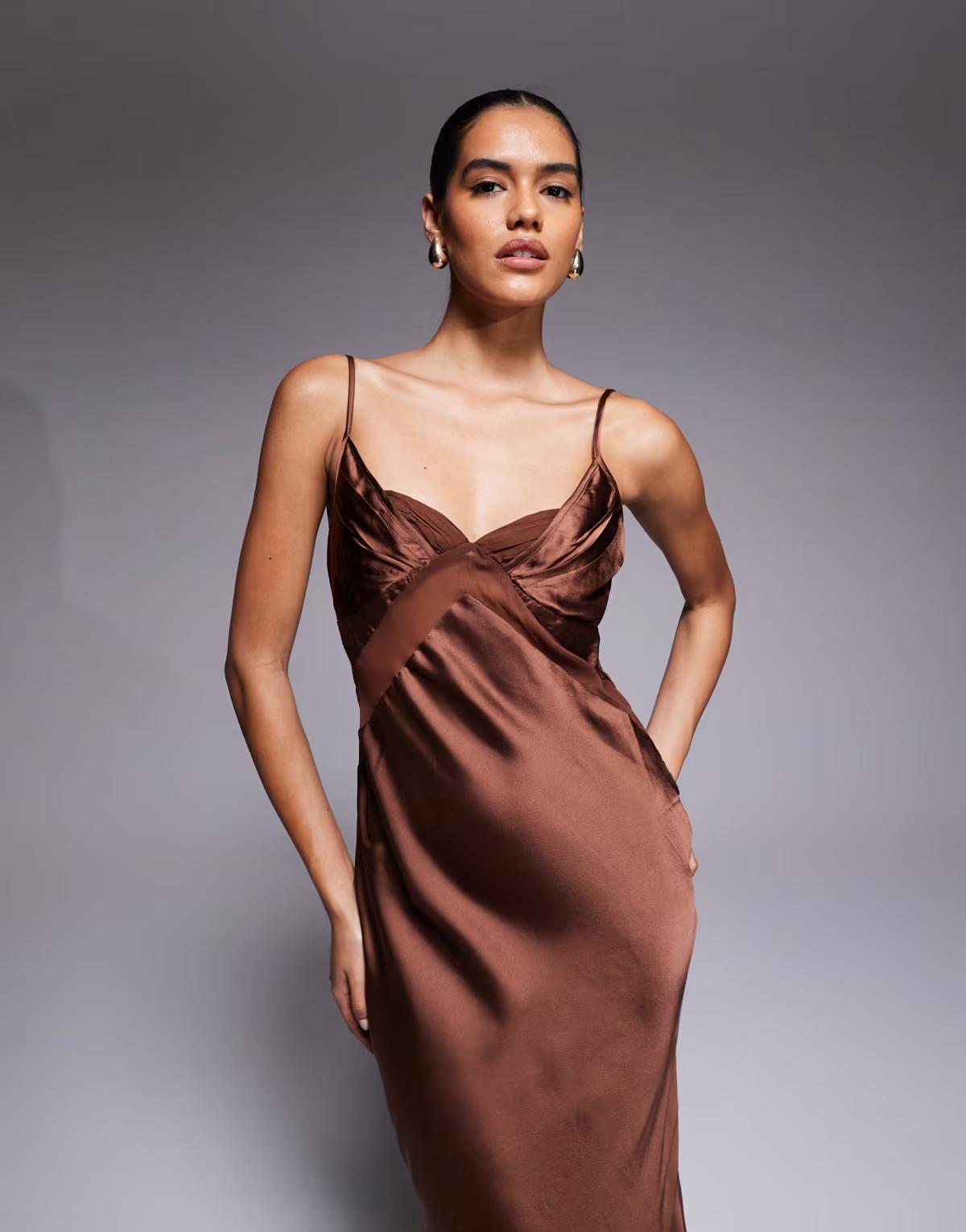 ASOS DESIGN satin chiffon mix bust panelled maxi dress in chocolate