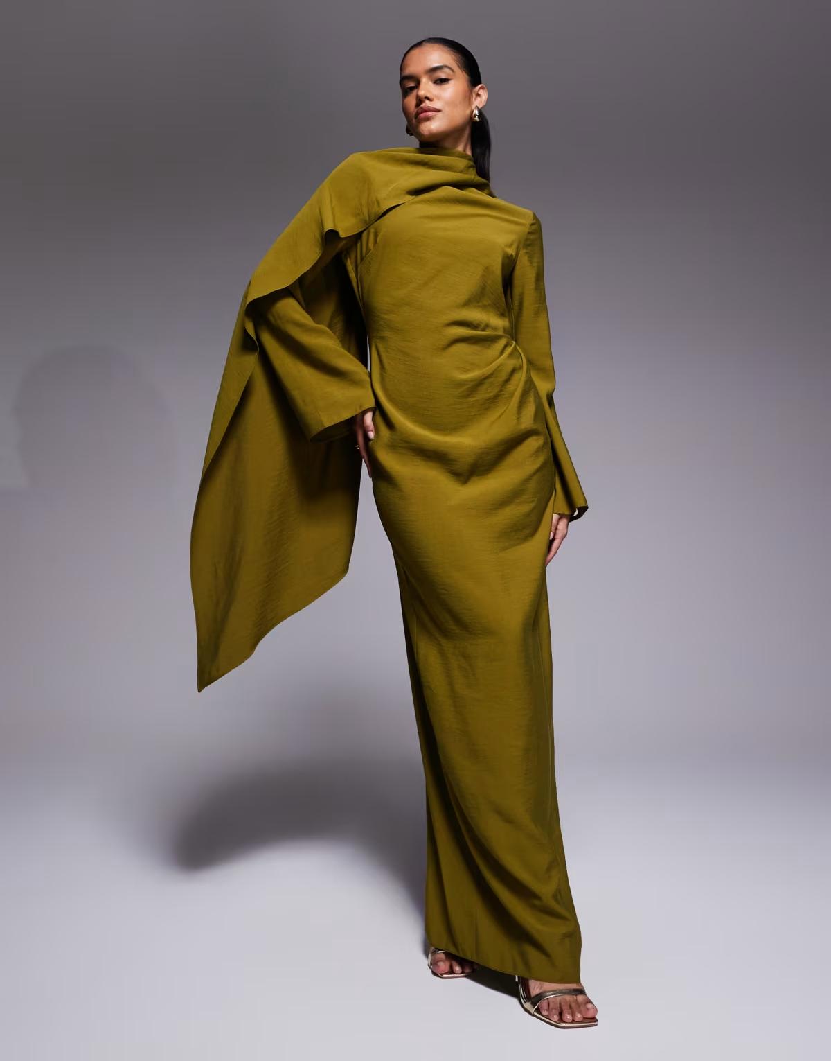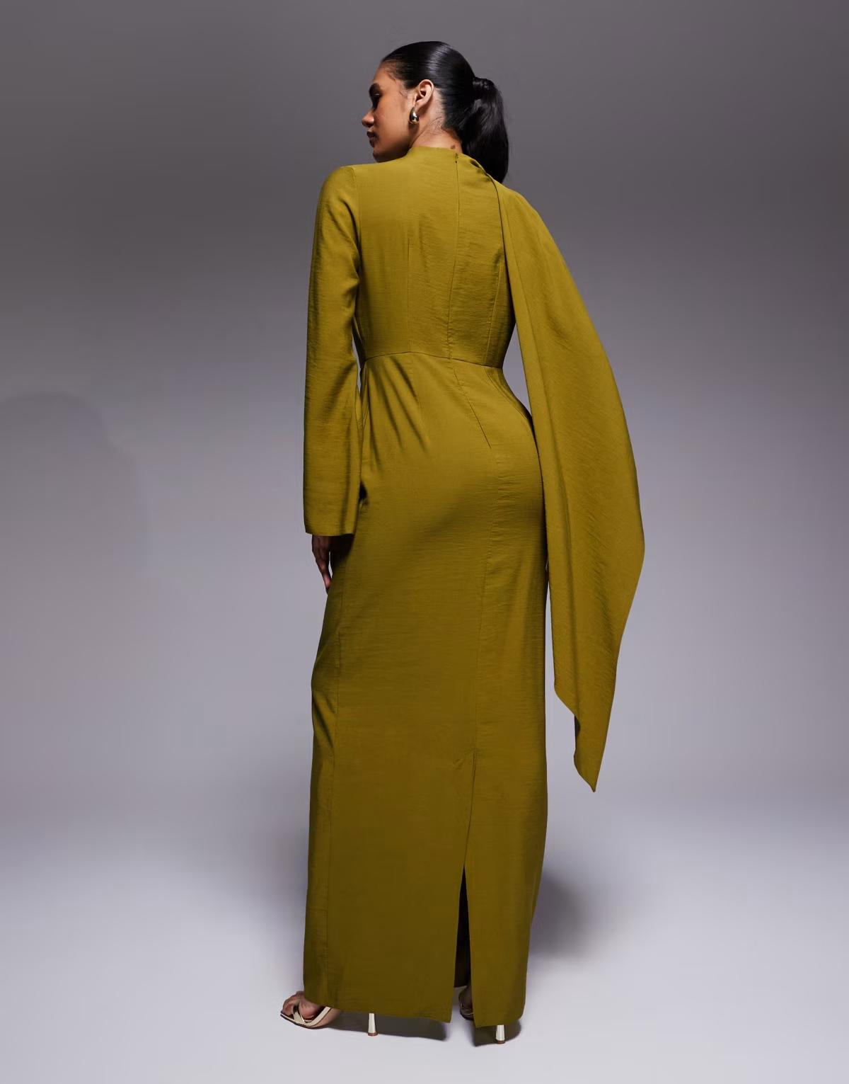 ASOS DESIGN long sleeved scarf detail maxi dress in olive