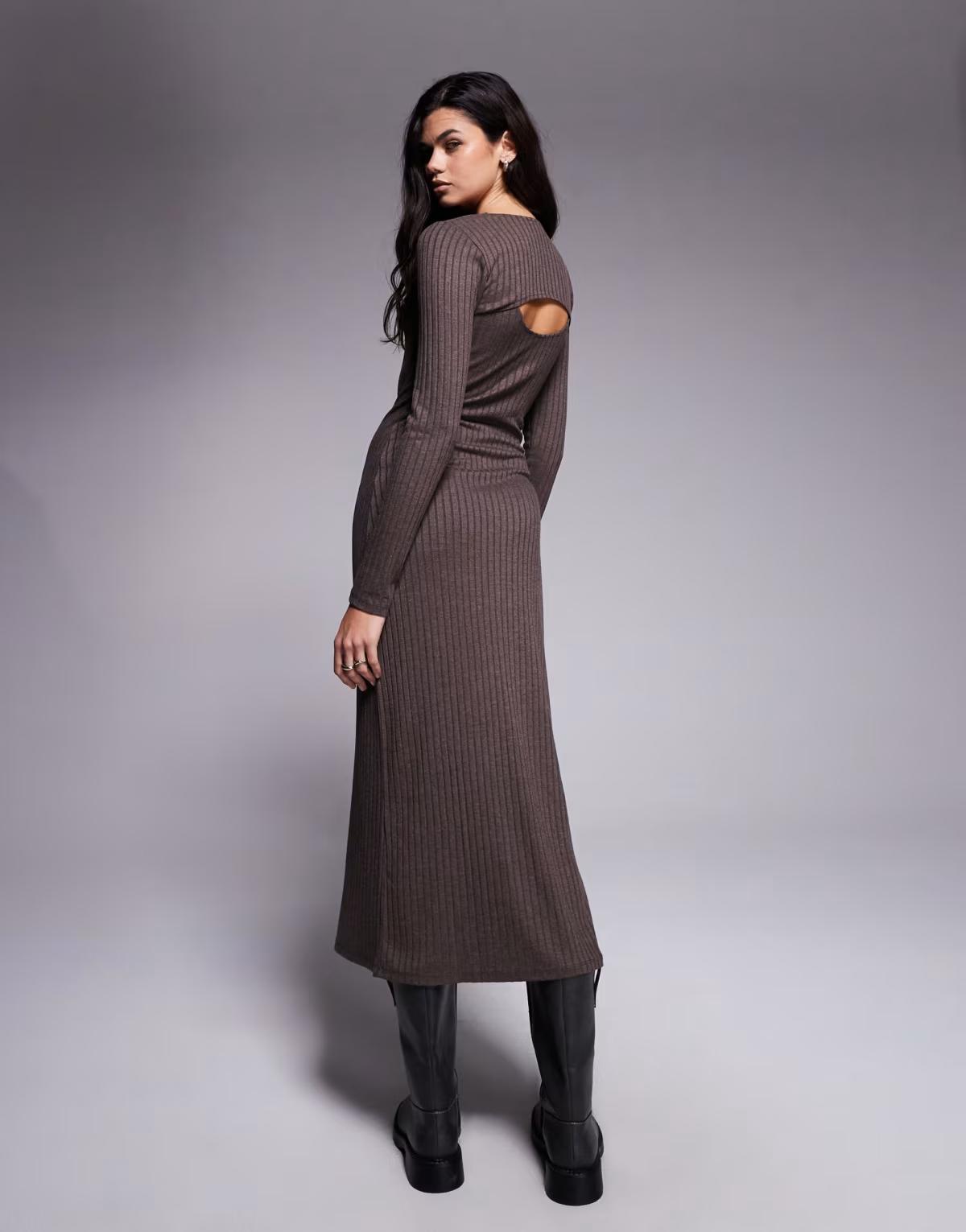 ASOS DESIGN ribbed long sleeve button scoop maxi dress with cardigan detail in chocolate