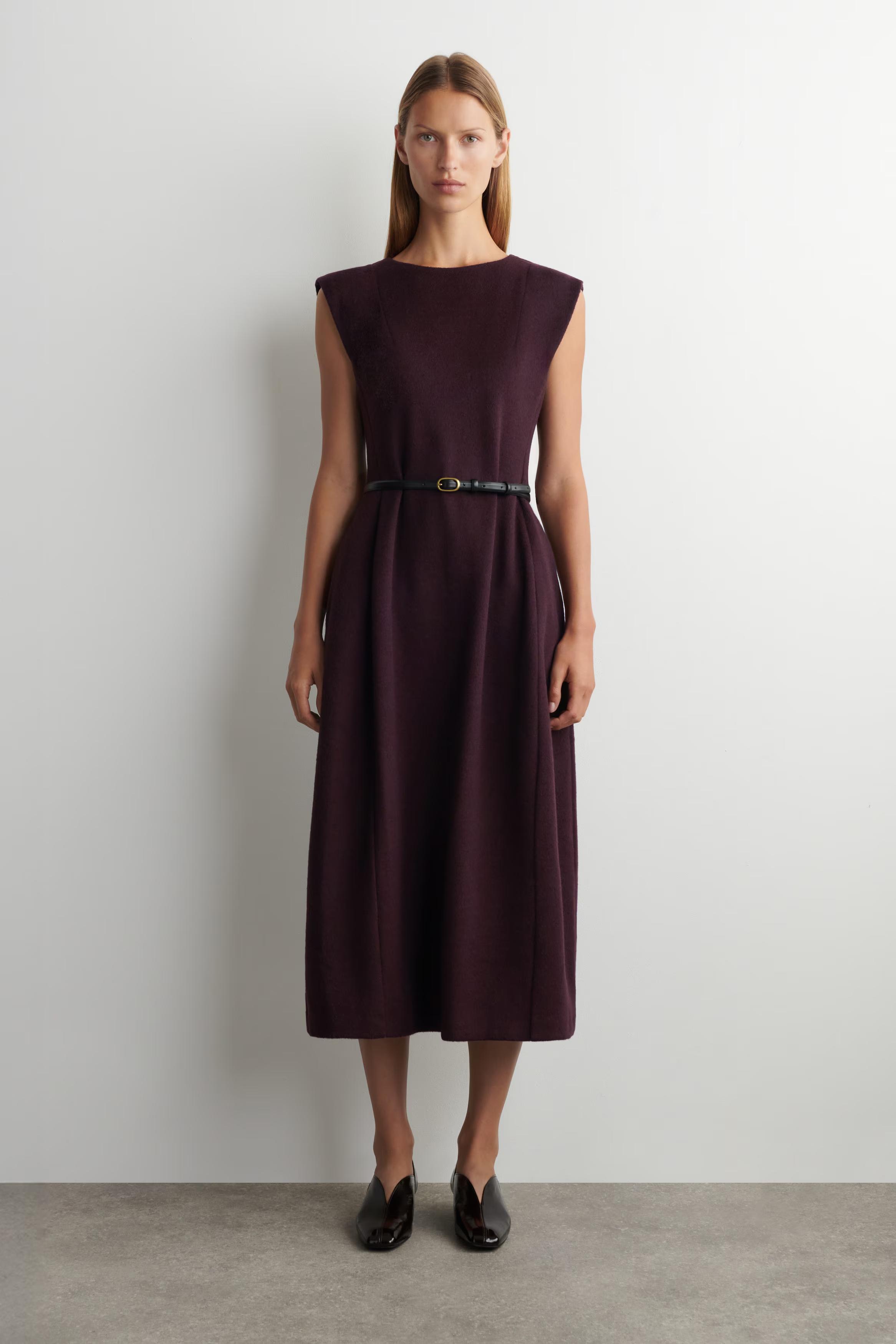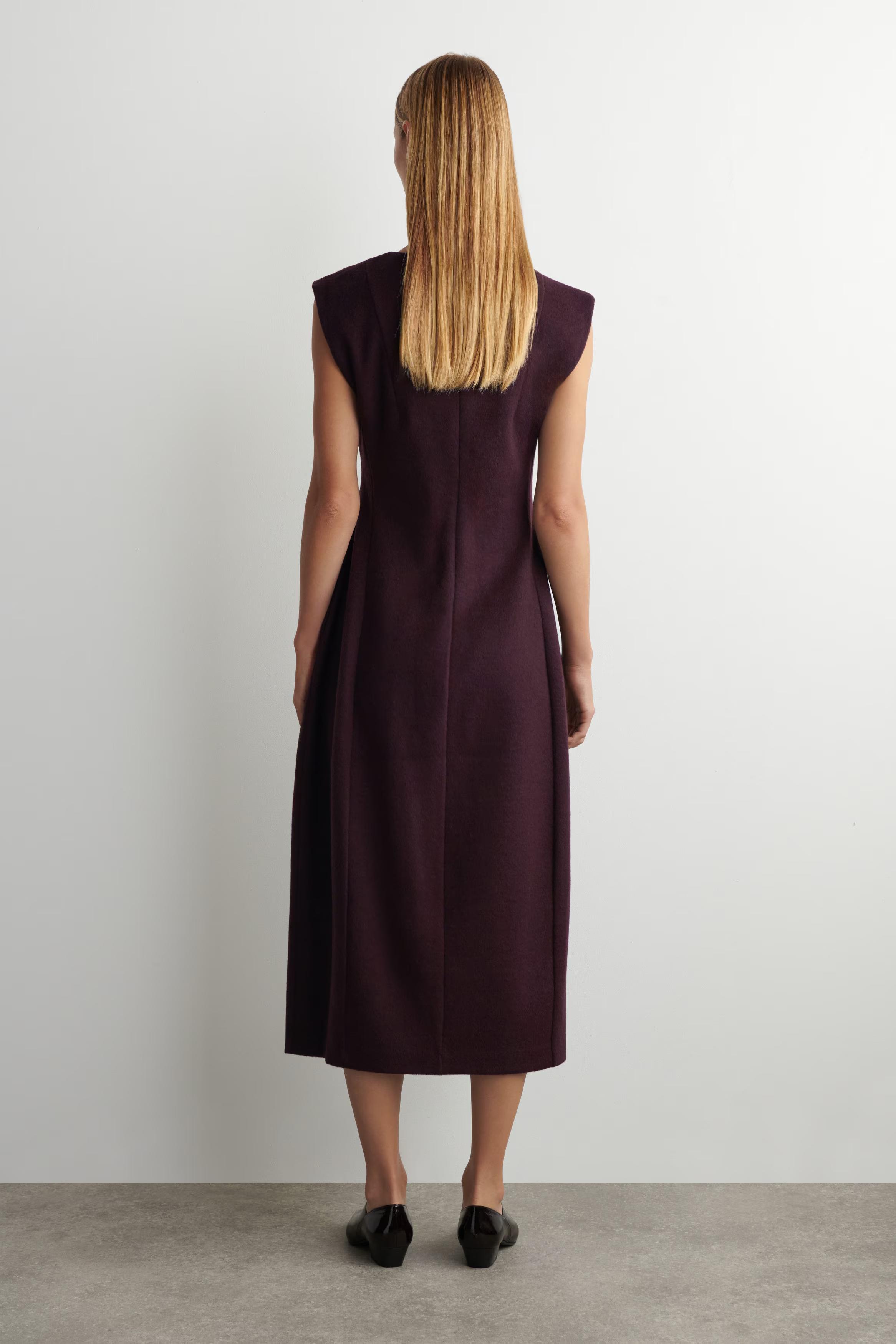 Sculptural in silhouette, this refined midi dress is shaped with shoulder darts, a fitted waist and a softly flared skirt. It's crafted from a wool blend that's brushed for a luxuriously tactile handle and rendered in a rich burgundy tone.\u0026nbsp;Regular fitZip closureThis product contains Responsible Wool Standard TE-00047206 (RWS) wool fibre from farms certified to animal welfare and land-management requirements\u0026nbsp;Shell: 68% RWS wool, 18% Recycled polyester, 14% ECOVERO\u0026trade; viscose. Lining: 100% Cotton. Excluding trims / Dry clean\u0026nbsp;Back length of size S is 120cm / Model wears a size S