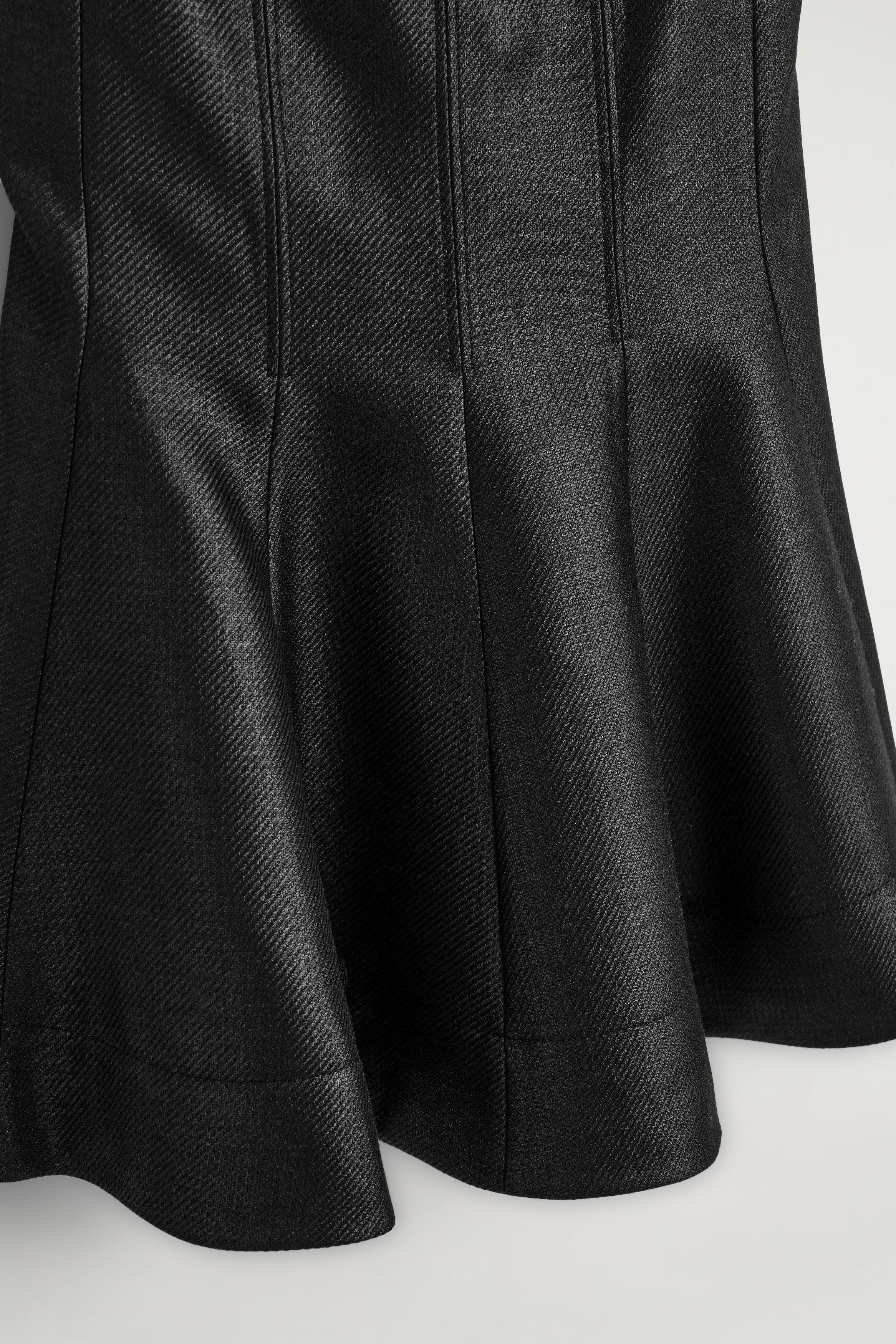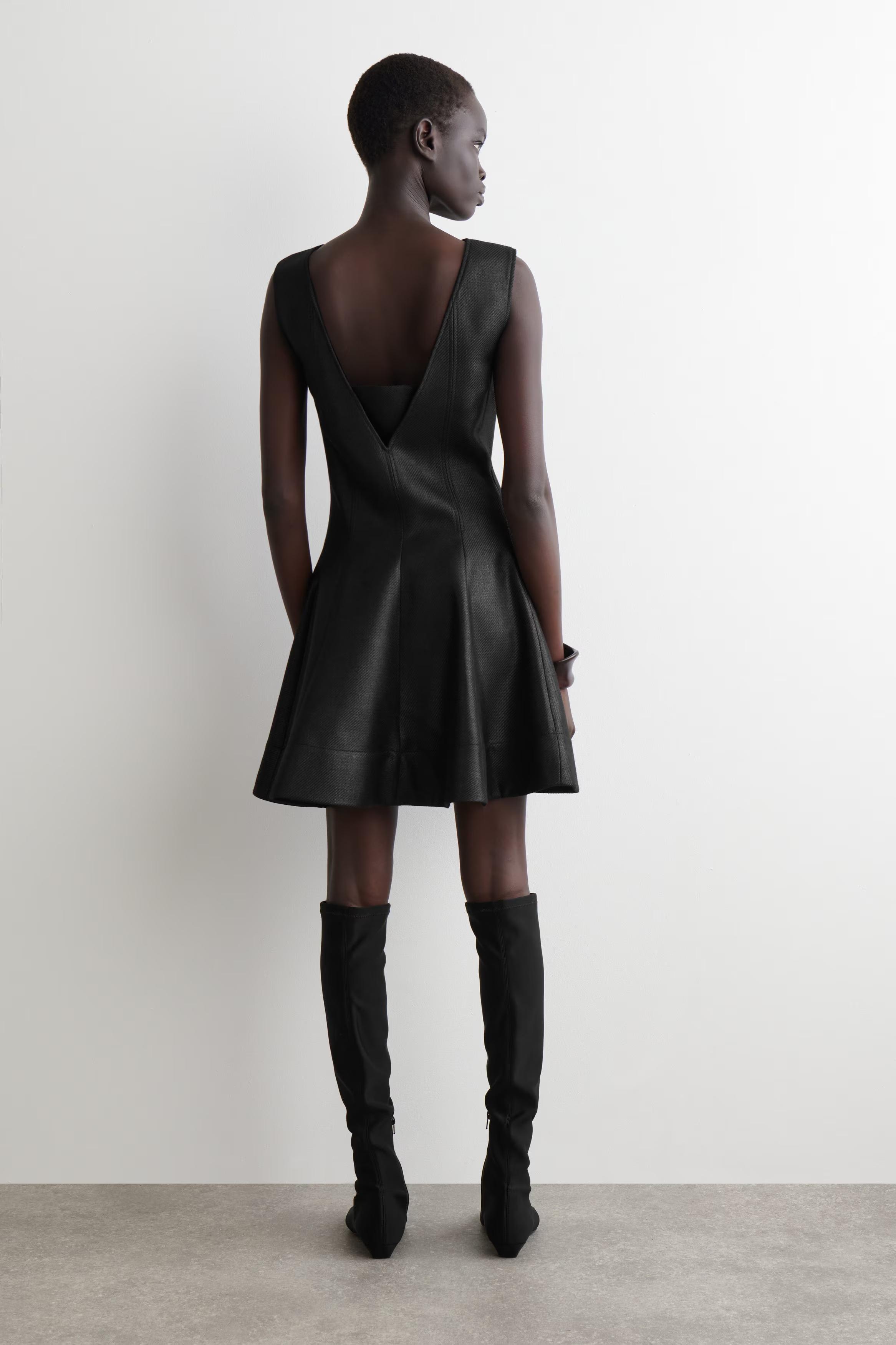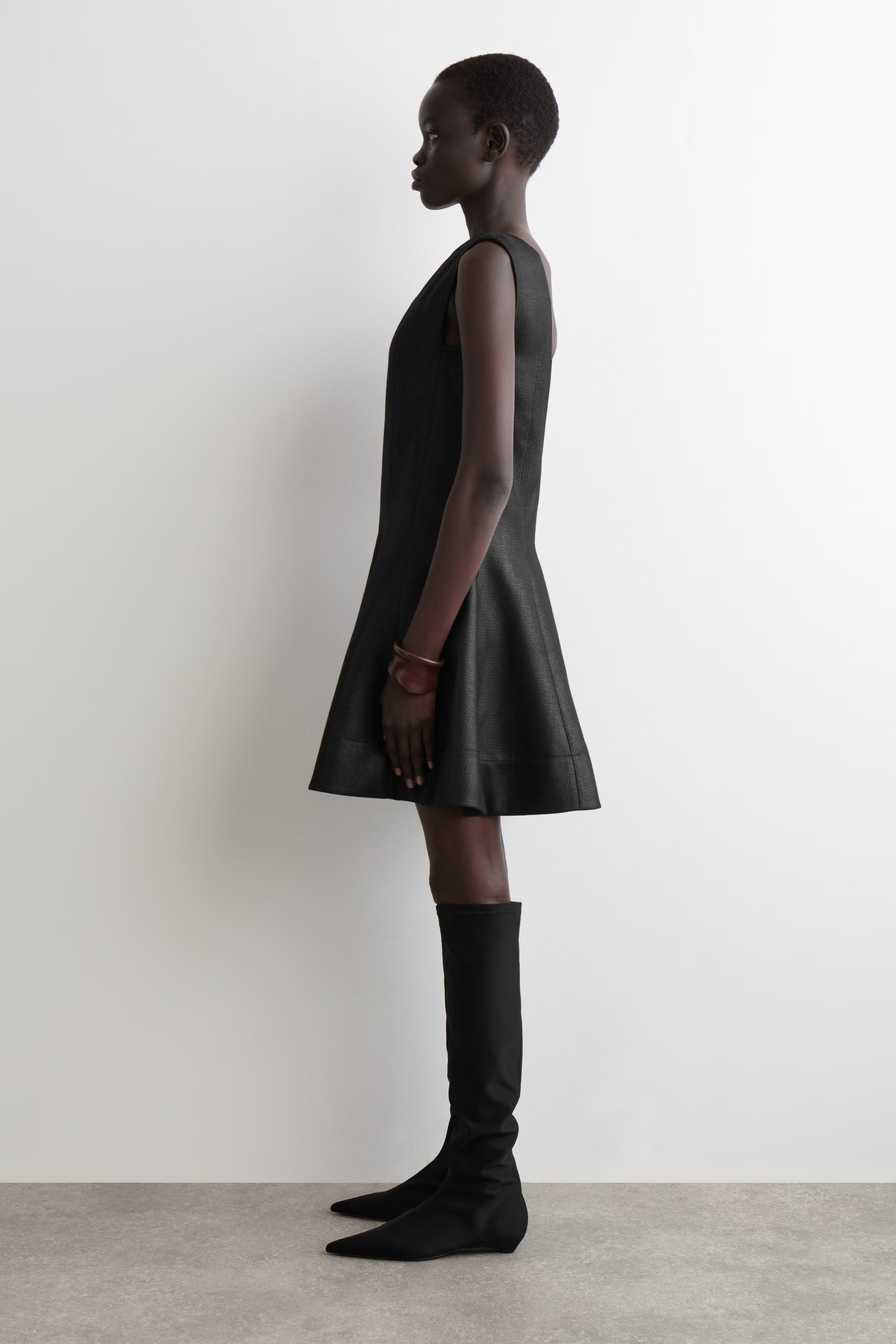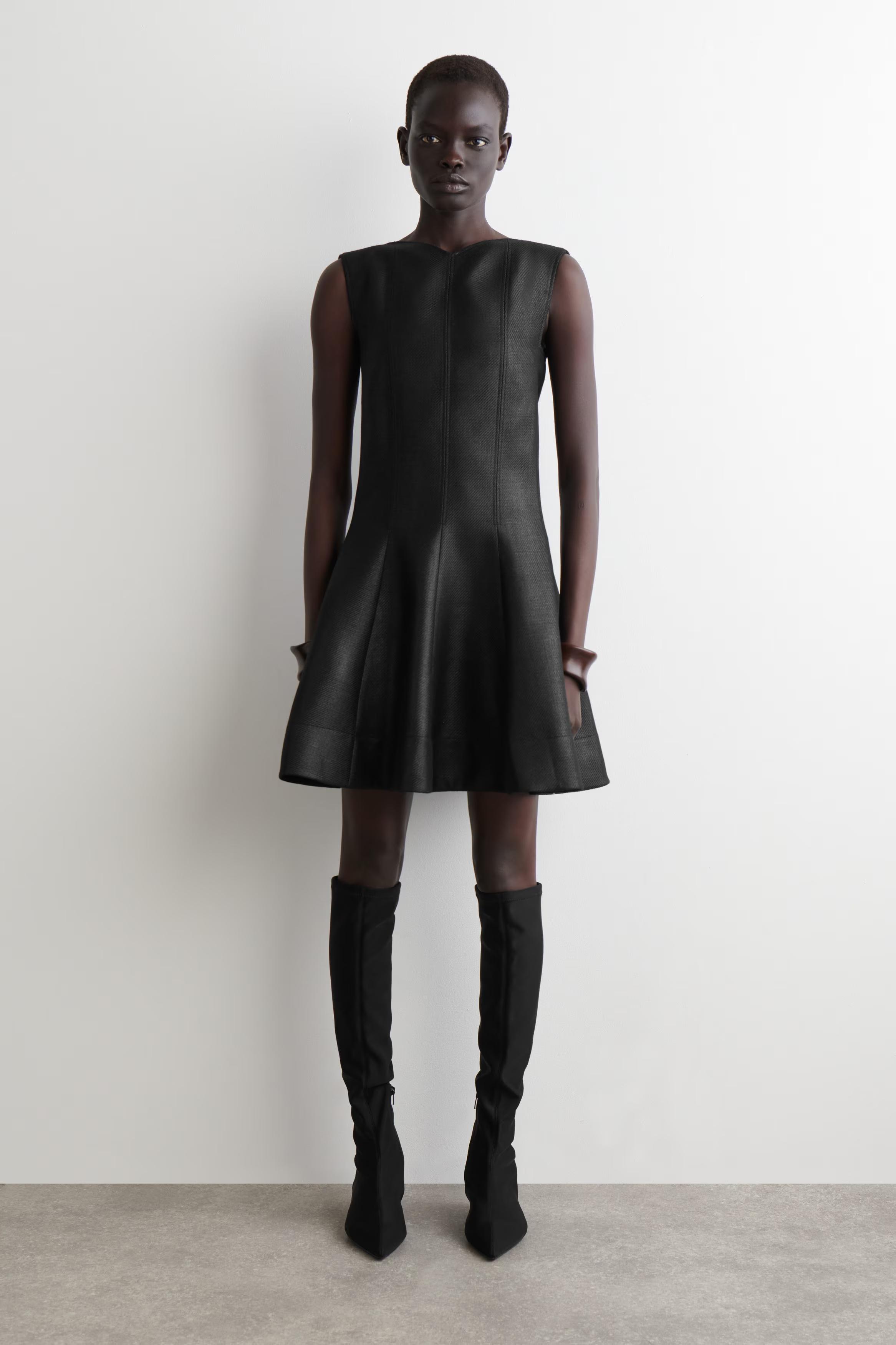 Muted metallics amplify classic silhouettes for soir\u0026eacute;e season. This A-line mini dress is crafted from a premium wool blend that shines subtly under the light and features a V-neck, dropped waist and a panel that frames the open back. Style it with kitten heels.\u0026nbsp;Regular fitZip closureRecycled polyester is polyester made from PET bottles or end-of-life textile waste. The PET bottles or textile waste is mechanically recycled and processed into new yarn\u0026nbsp;Shell: 65% Recycled polyester, 35% RWS Wool. Excluding trims / Dry clean\u0026nbsp;Back length of size EU 36 is 49.9cm / Model wears a size EU 36