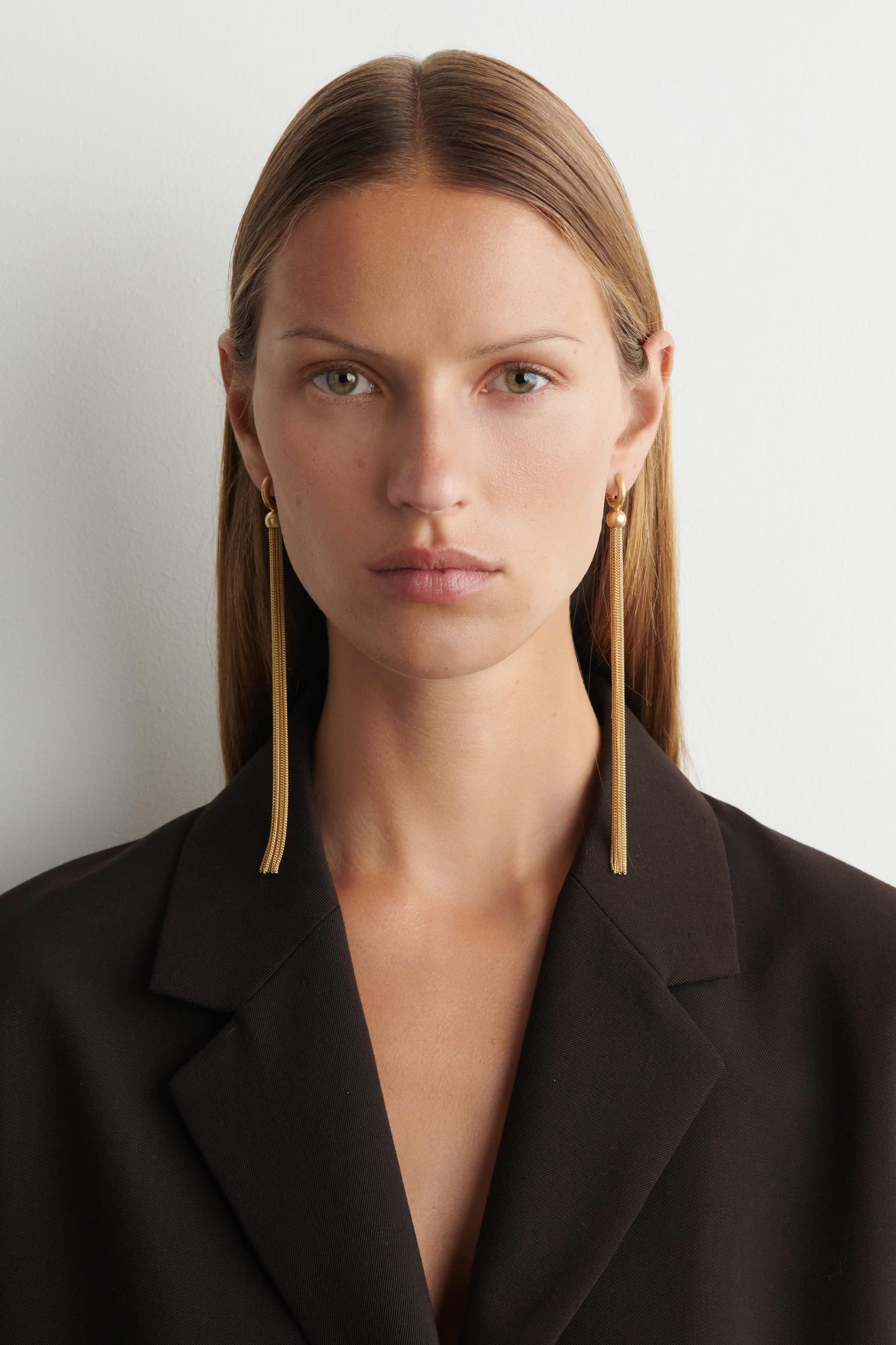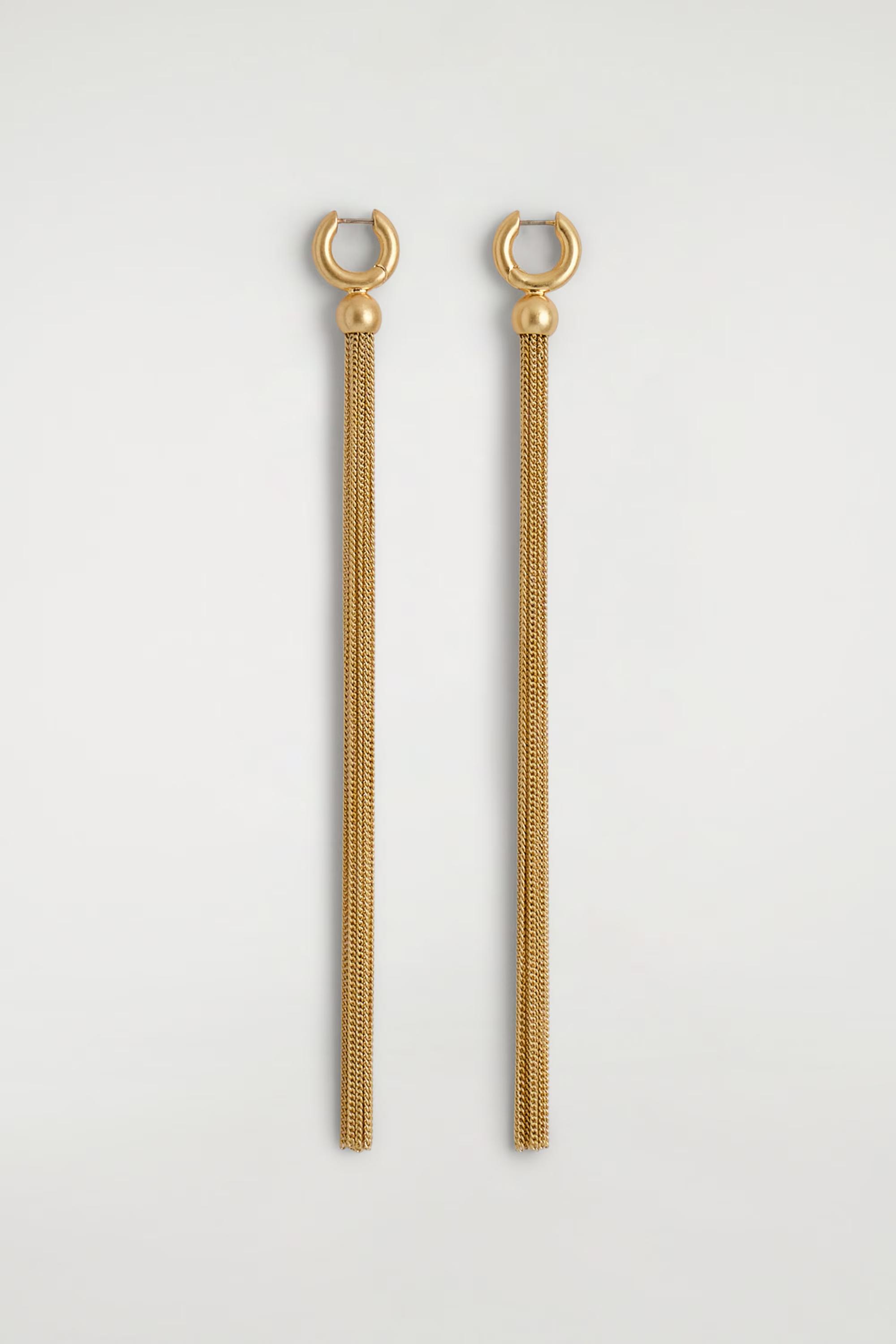 This season, the COS jewellery designers capture the art of simple yet impactful silhouettes. Crafted from silver-plated recycled brass, these striking hoop earrings are detailed with elongated tasselled chains that cascade from a tonal sphere. Style them with your hair tied back.\u0026nbsp;Hinge closureBrass is a versatile material that can be recycled numerous times without losing any of its properties\u0026nbsp;\u0026nbsp;Shell: 100% Post-consumer recycled brass. Plating: 100% Silver. Excluding trims