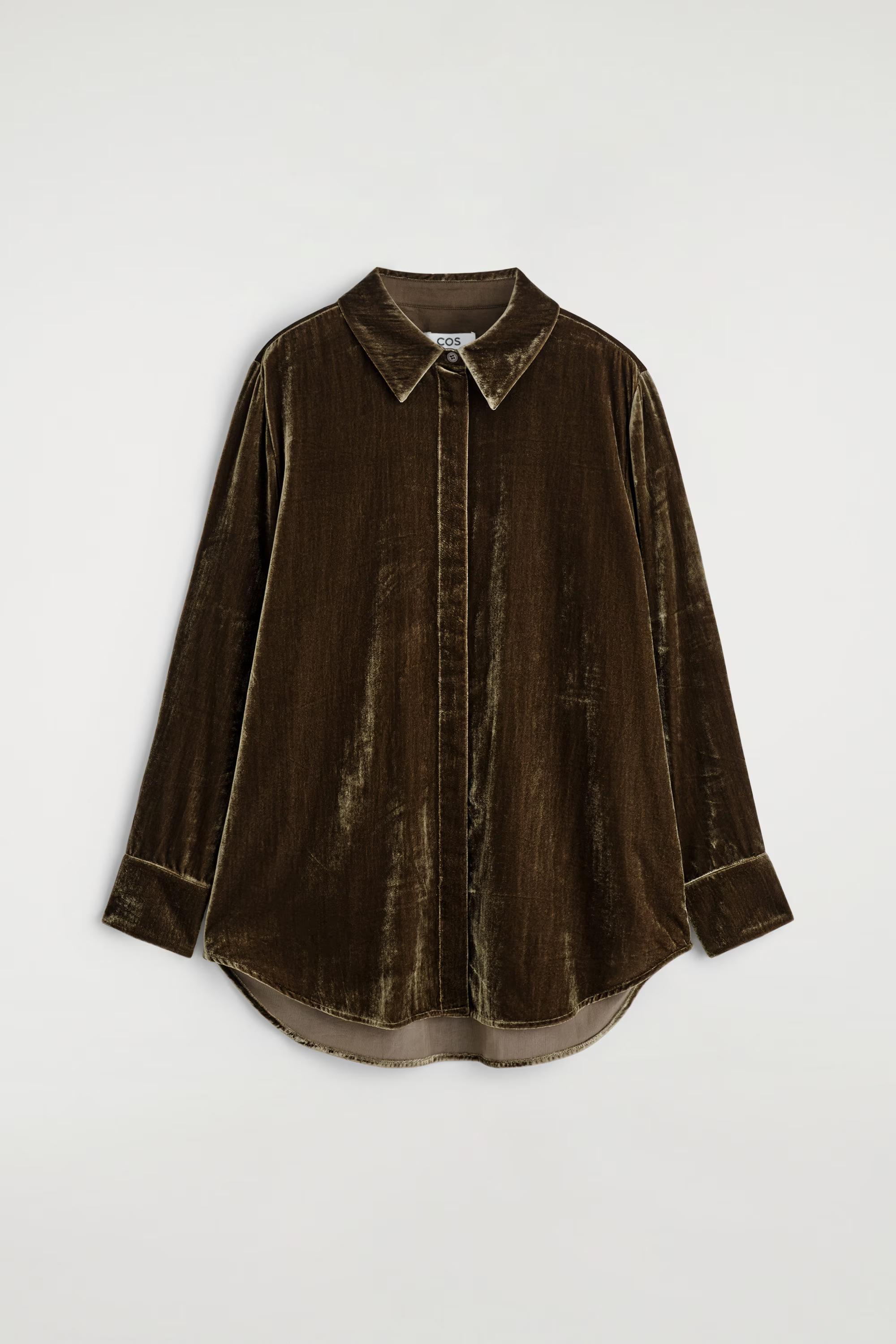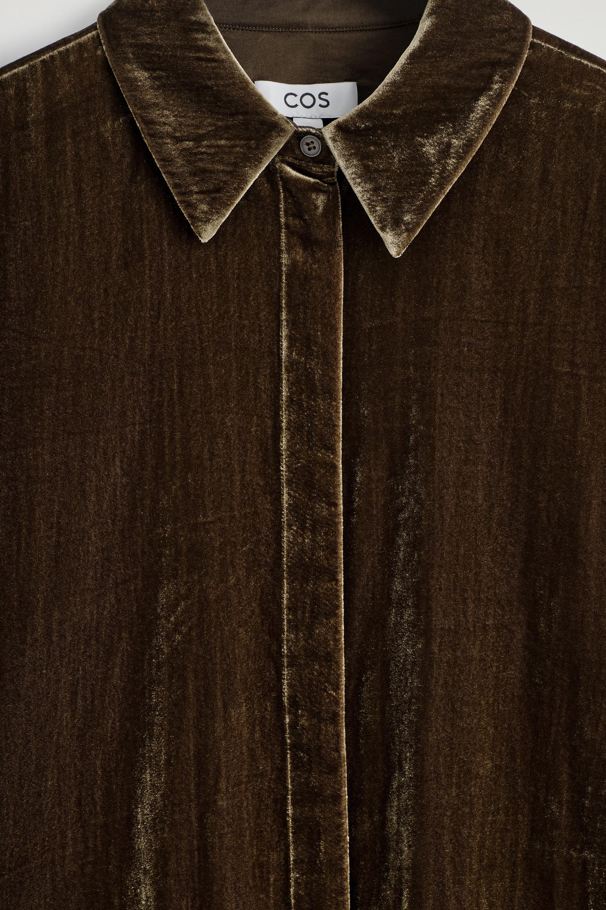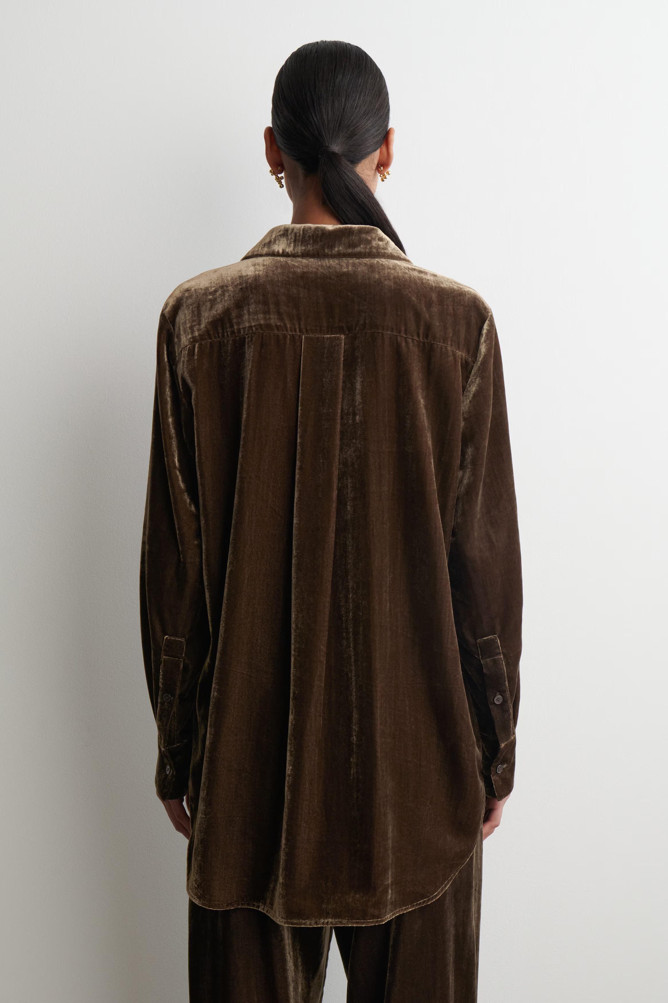 A prelude to party season, this shirt is crafted from luxuriously tactile velvet in a rich chocolate tone. It's cut in a relaxed silhouette and designed with a pointed collar, concealed buttons and a pleat at the back. Style it with the\u0026nbsp;coordinating trousers for maximum impact.\u0026nbsp;Relaxed fitButton closureRecycled polyamide is polyamide made from textile waste in production\u0026nbsp;Shell: 77% Viscose, 22% Recycled polyamide (Recycled nylon). Excluding trims / Dry clean\u0026nbsp;Back length of size EU 36 is 75.1cm / Model wears a size EU 36