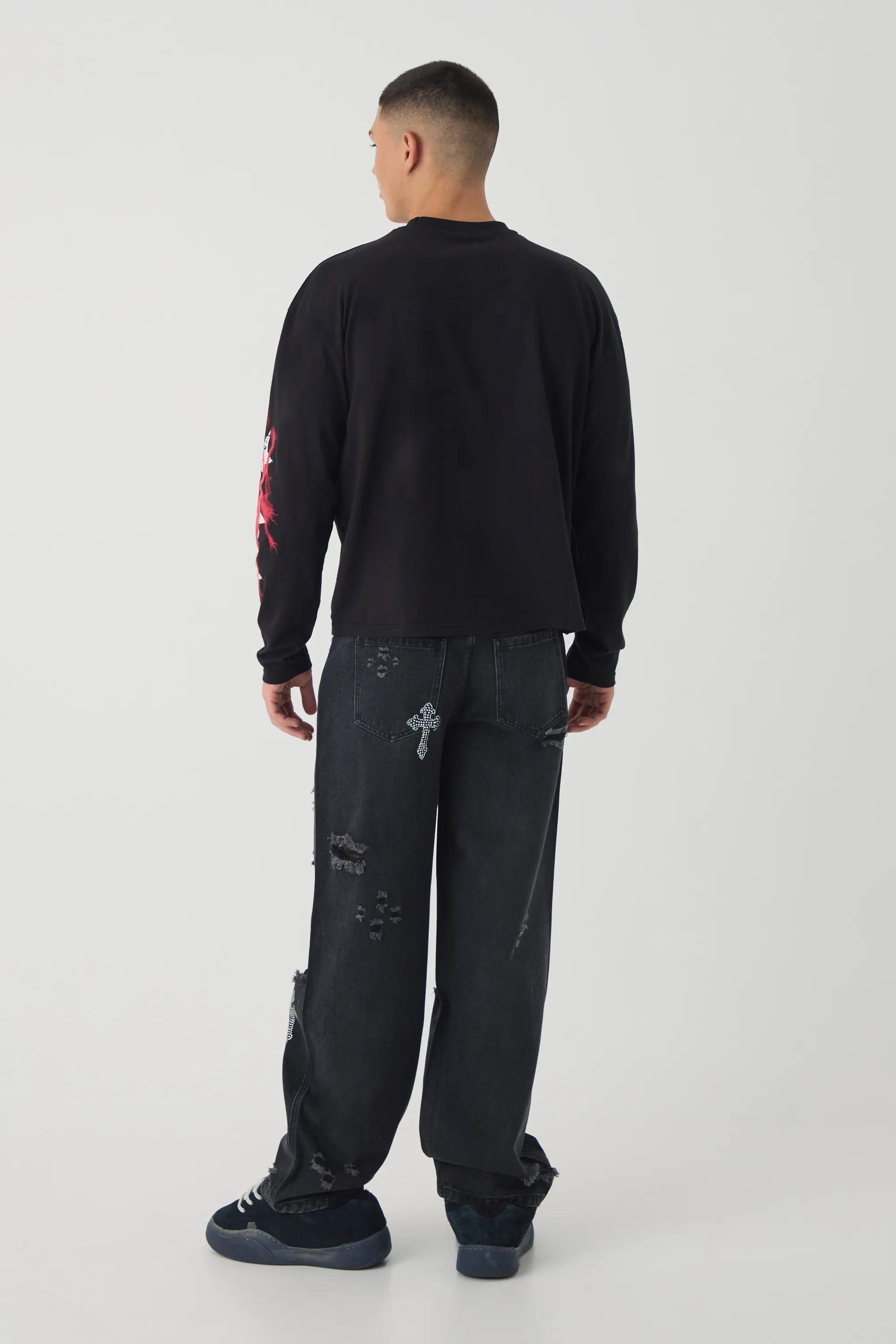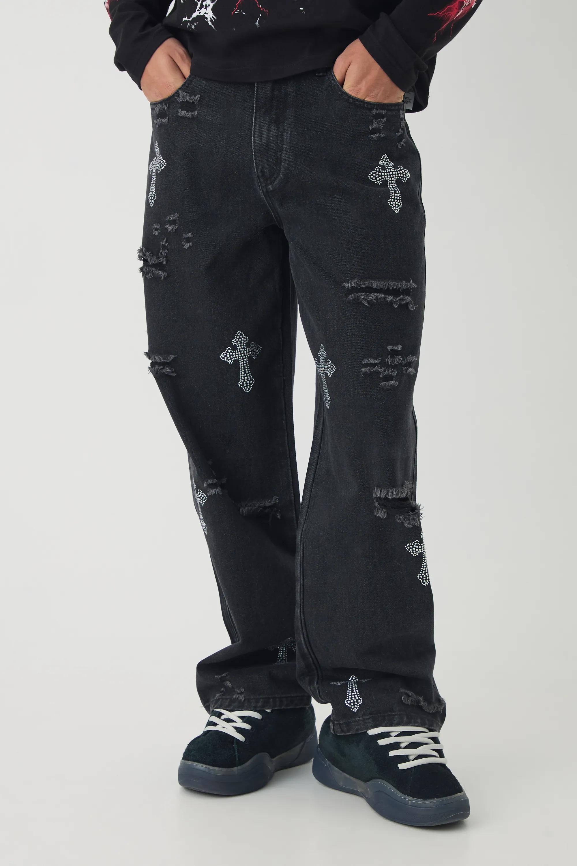 Jeans | Relaxed Fit Rhinestone Cross Ripped Washed Jeans | boohooMAN