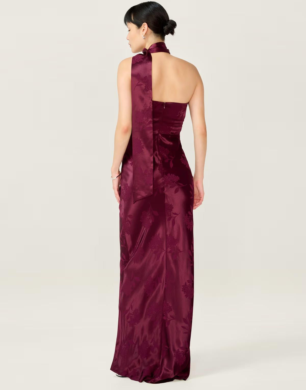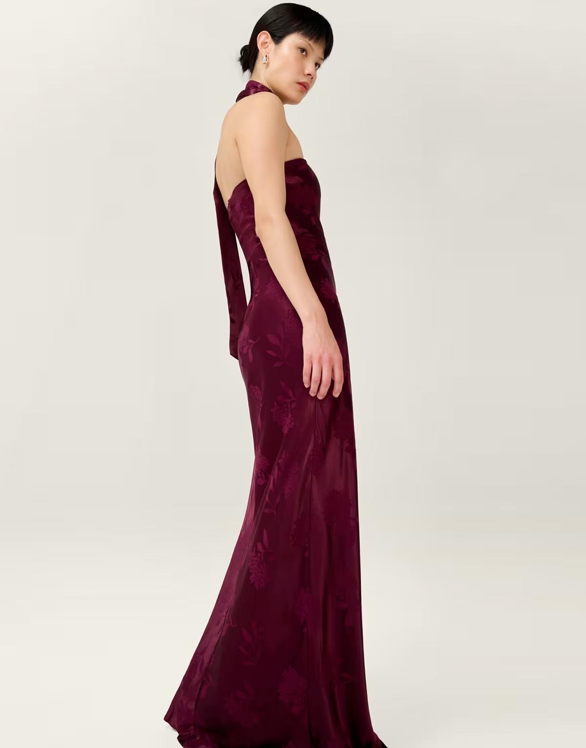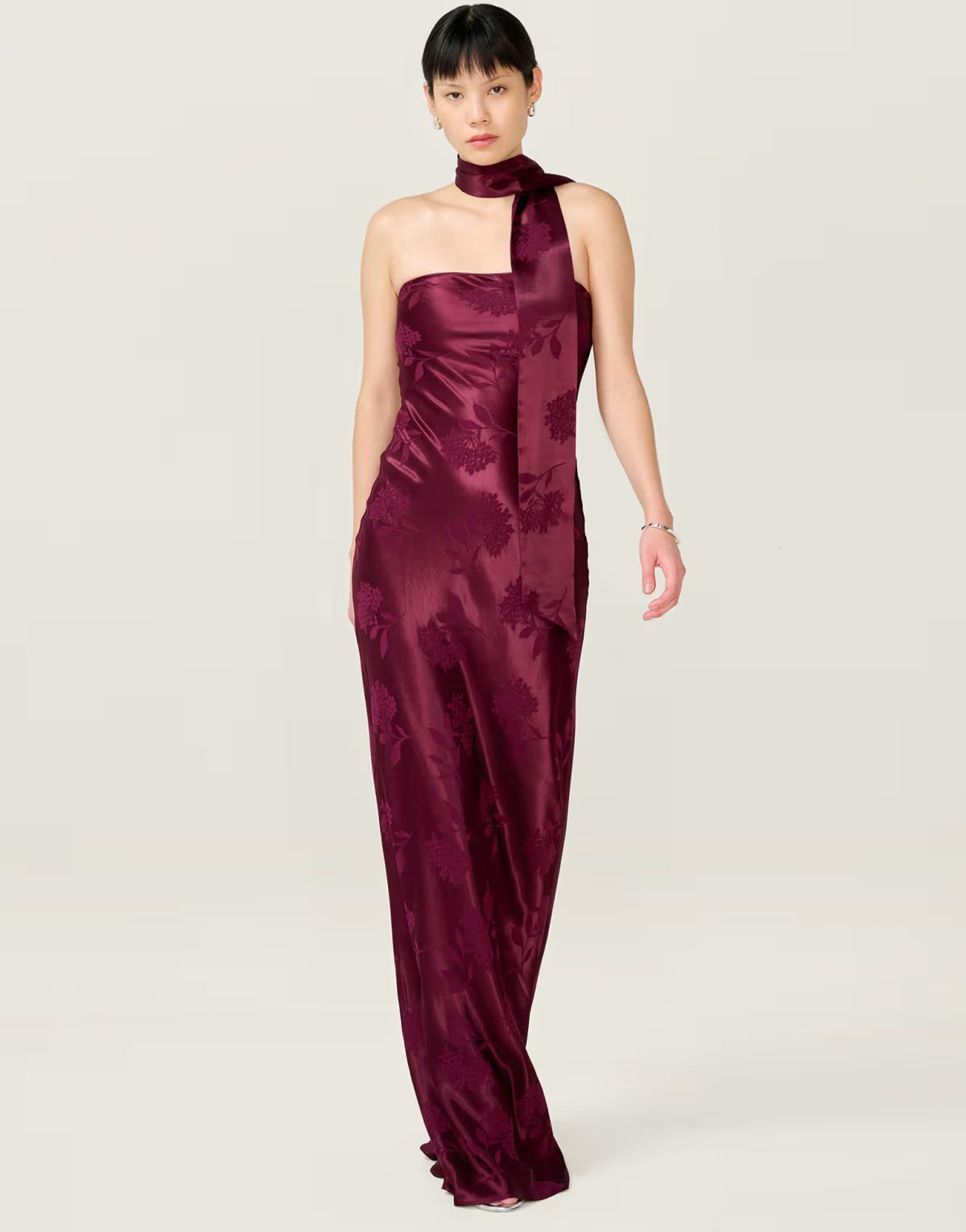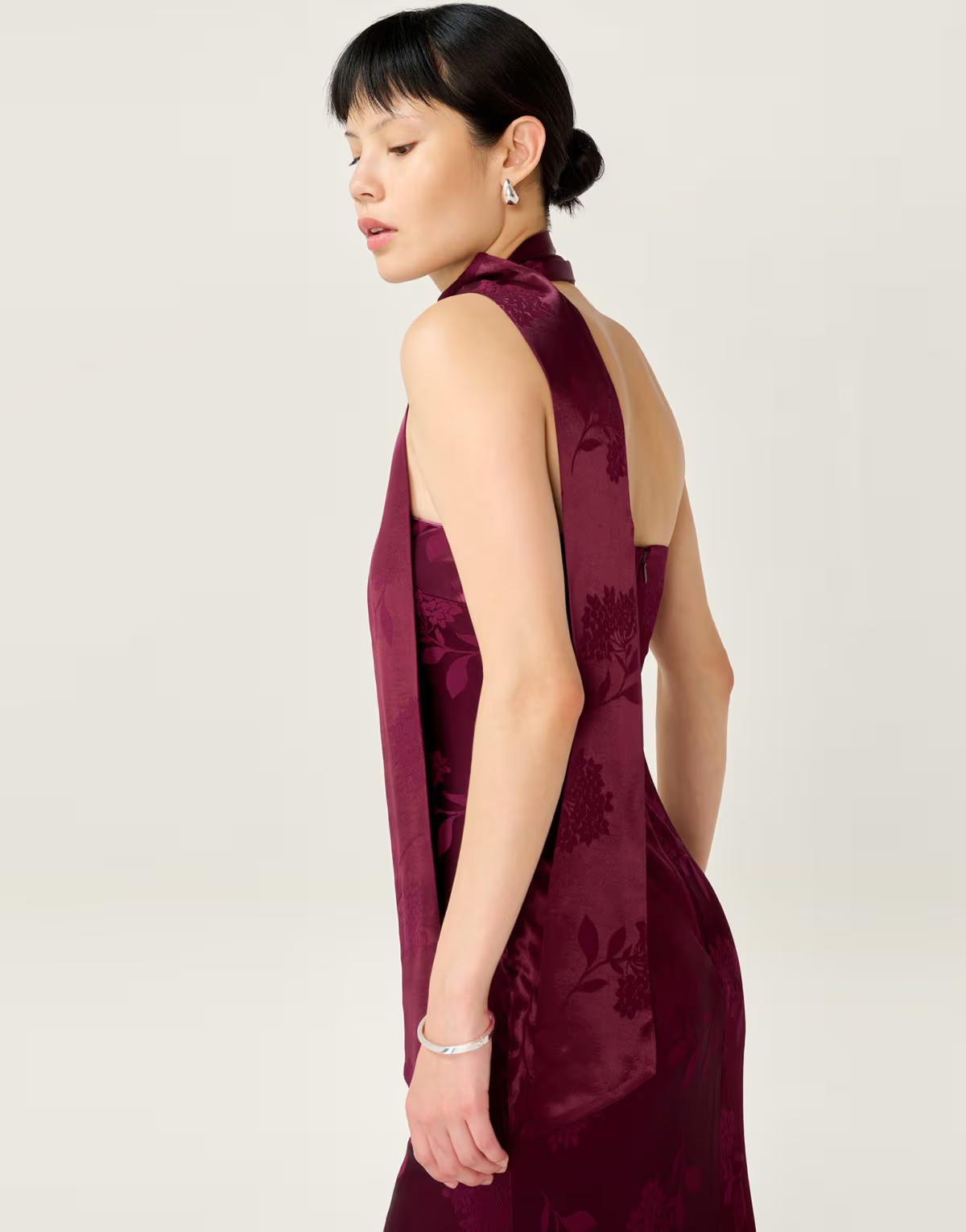 Omnes Dresses myla maxi fitted viscose floral jacquard dress in red with matching scarf detail in red