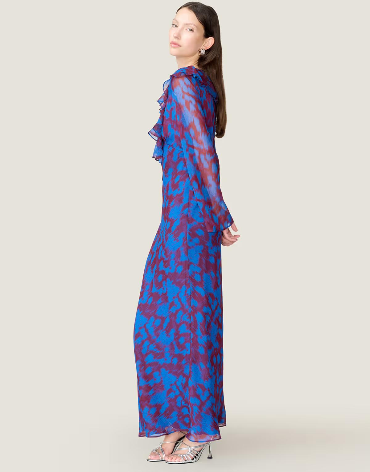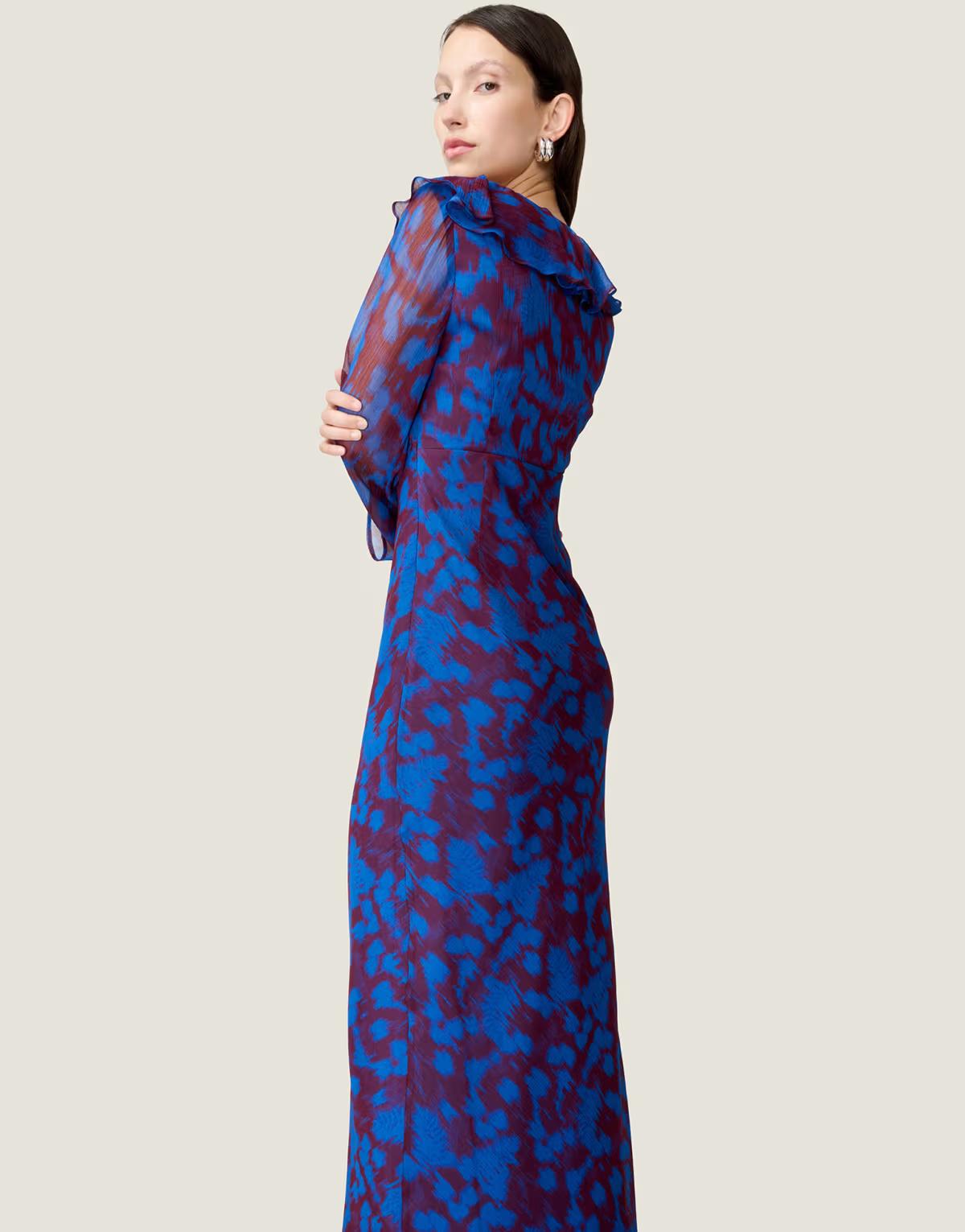 Omnes Dresses yvette chiffon v-neck flared sleeves ruffle detail dress in floral fern blue