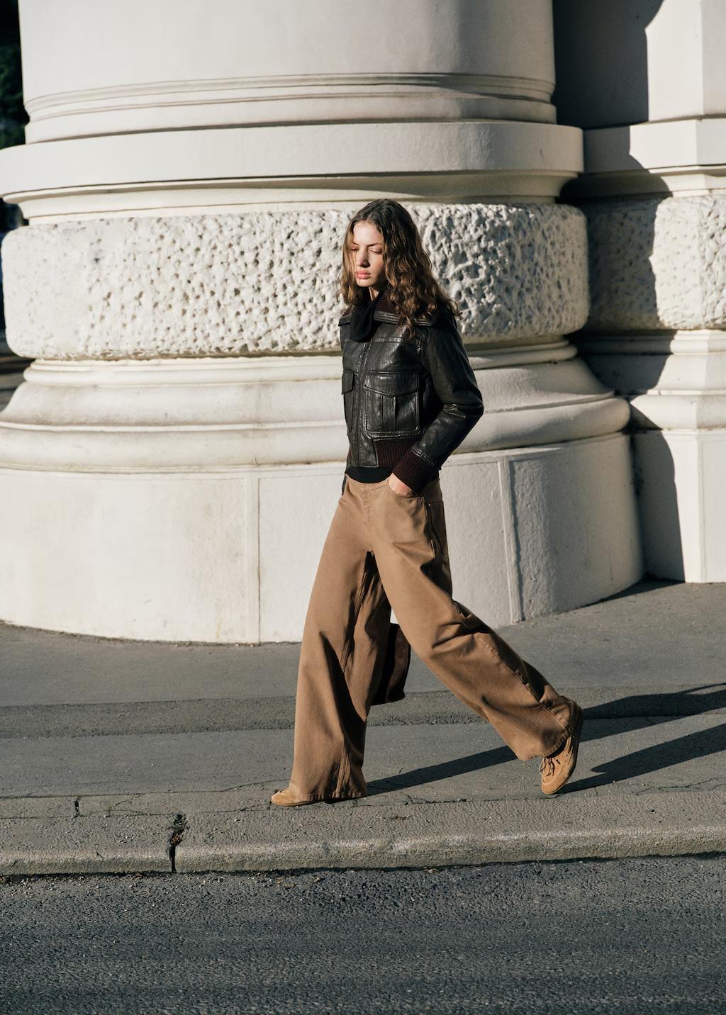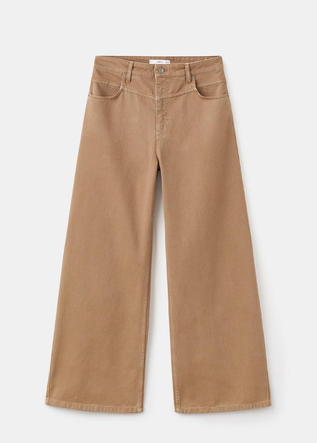 Tejido de algodón estilo tejano vaquero. Diseño largo. Diseño wide leg. Diseño loose. Tiro medio. Trabillas. Cinco bolsillos. Detalle de costura en la cadera. Cierre delantero de cremallera y botón
