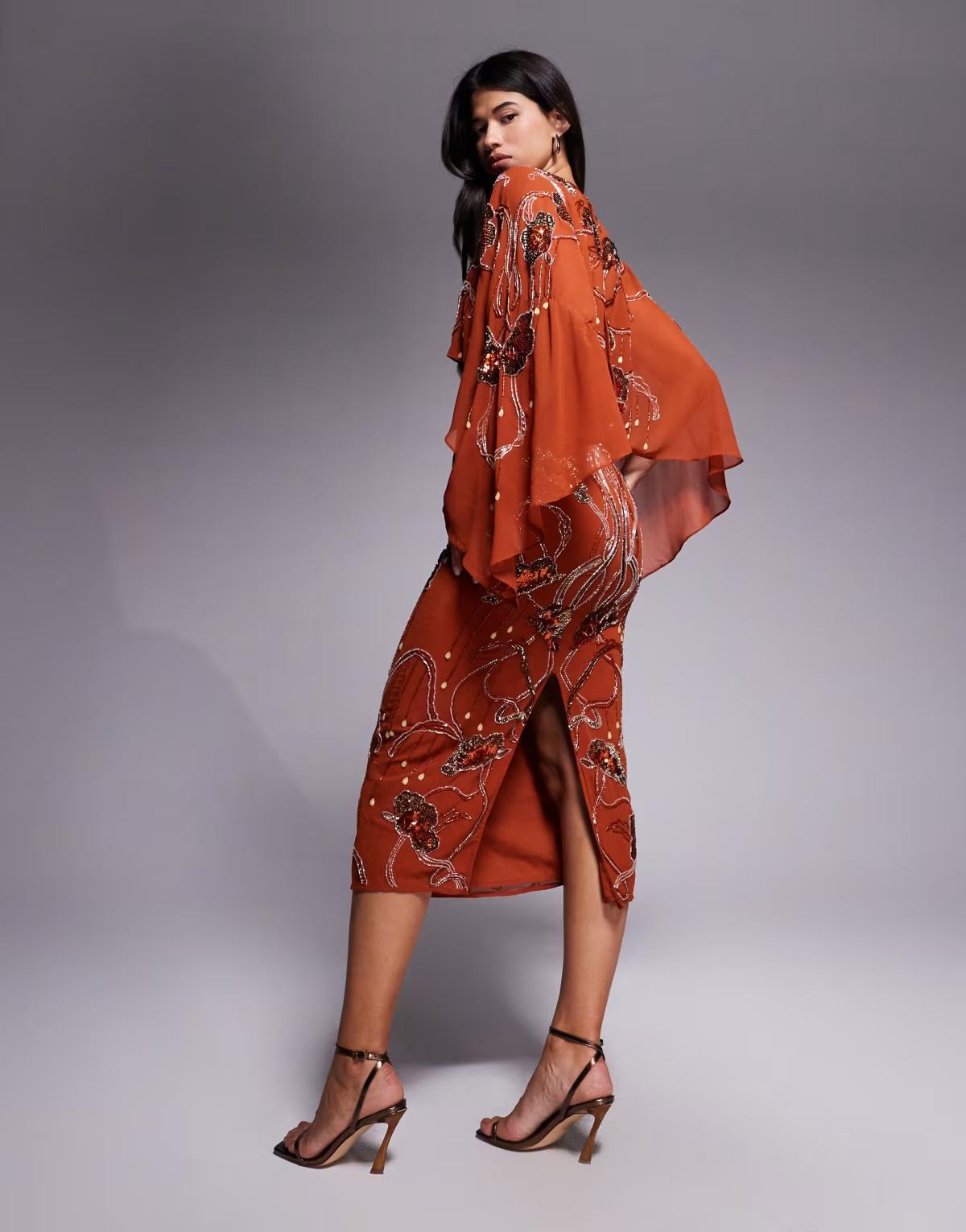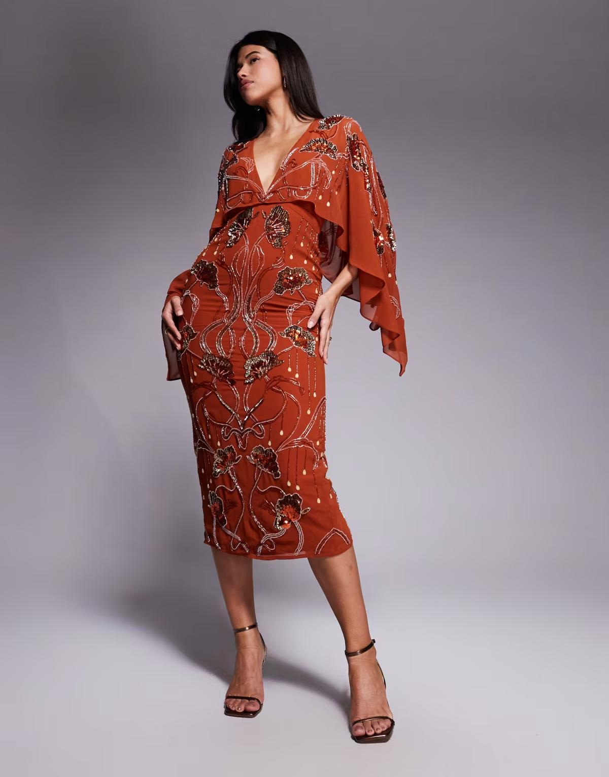 ASOS DESIGN cape midi dress with floral embellishment in burnt orange