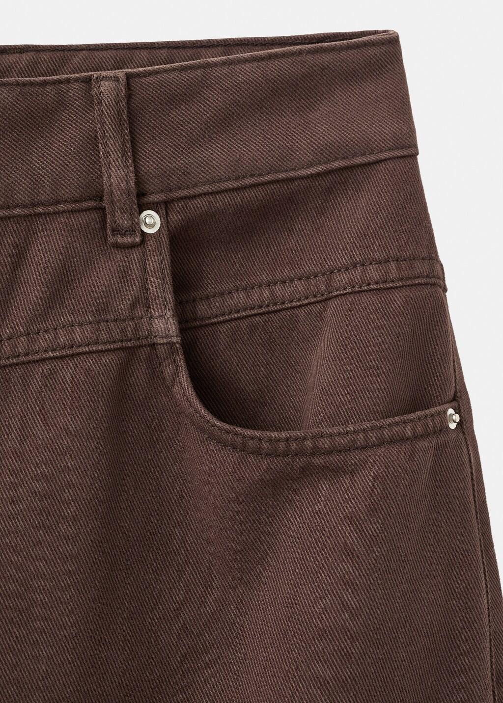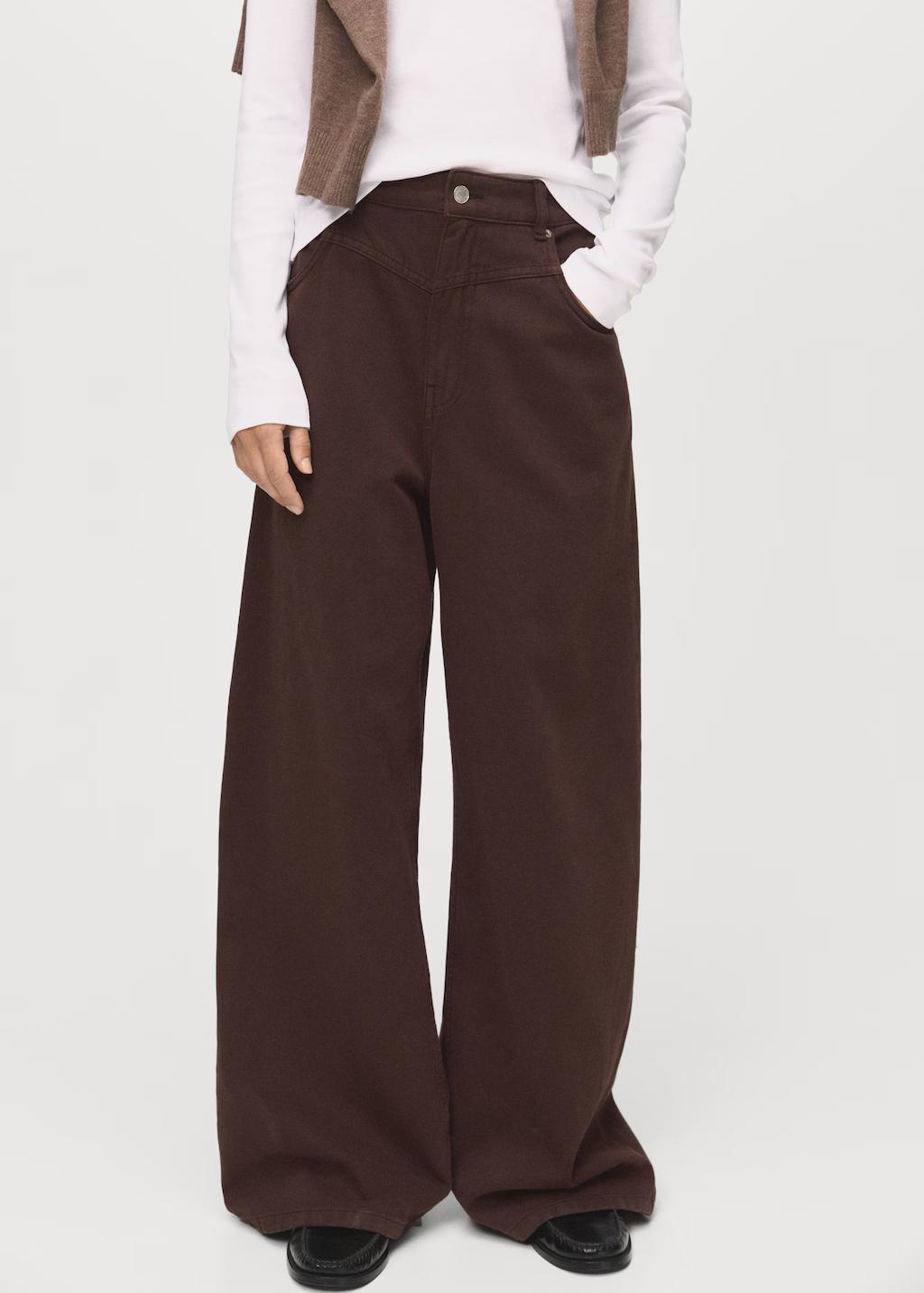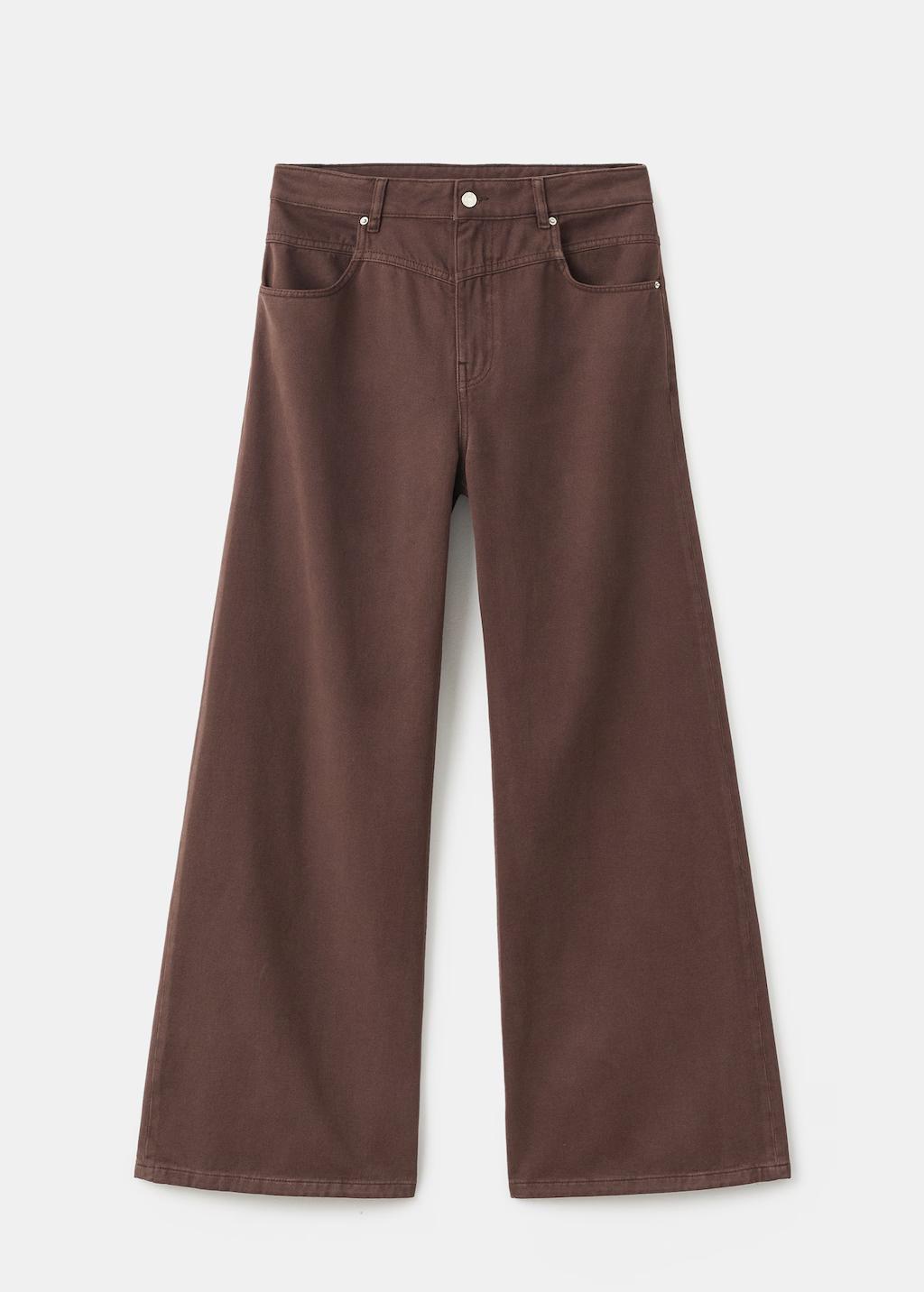 Tejido de algodón estilo tejano vaquero. Diseño largo. Diseño wide leg. Diseño loose. Tiro medio. Trabillas. Cinco bolsillos. Detalle de costura en la cadera. Cierre delantero de cremallera y botón