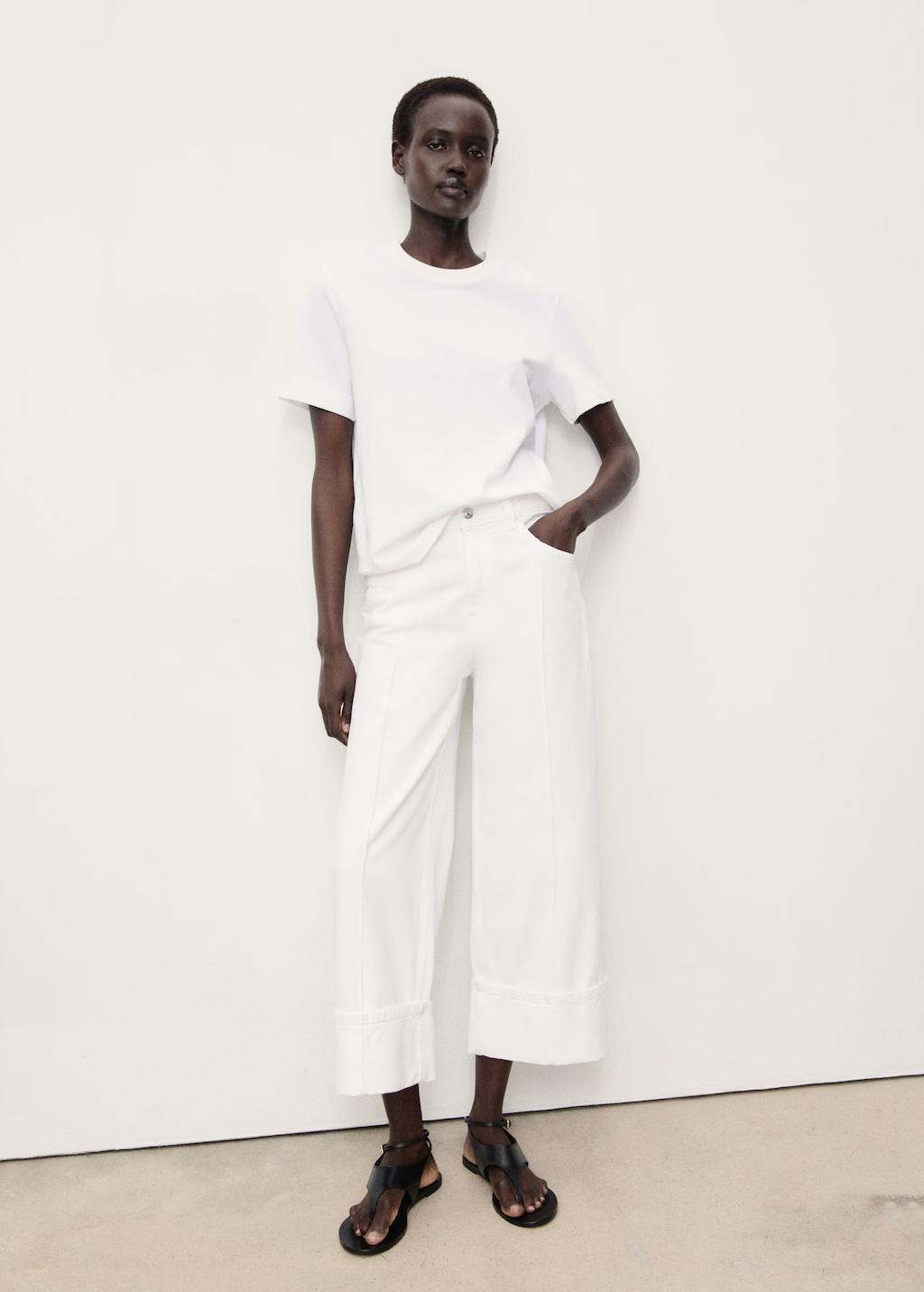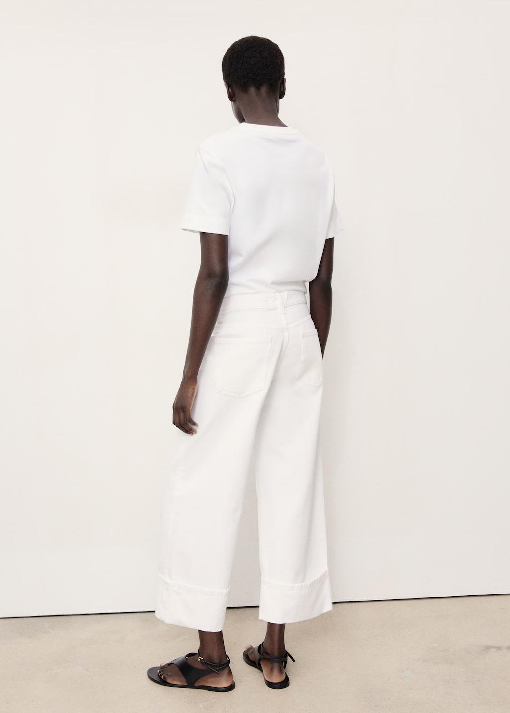Tejido de algodón estilo tejano vaquero. Diseño crop. Diseño wideleg. Tiro medio. Trabillas. Cinco bolsillos. Bajo vuelto. Cierre de botón y cremallera. Largo interior 63 cm