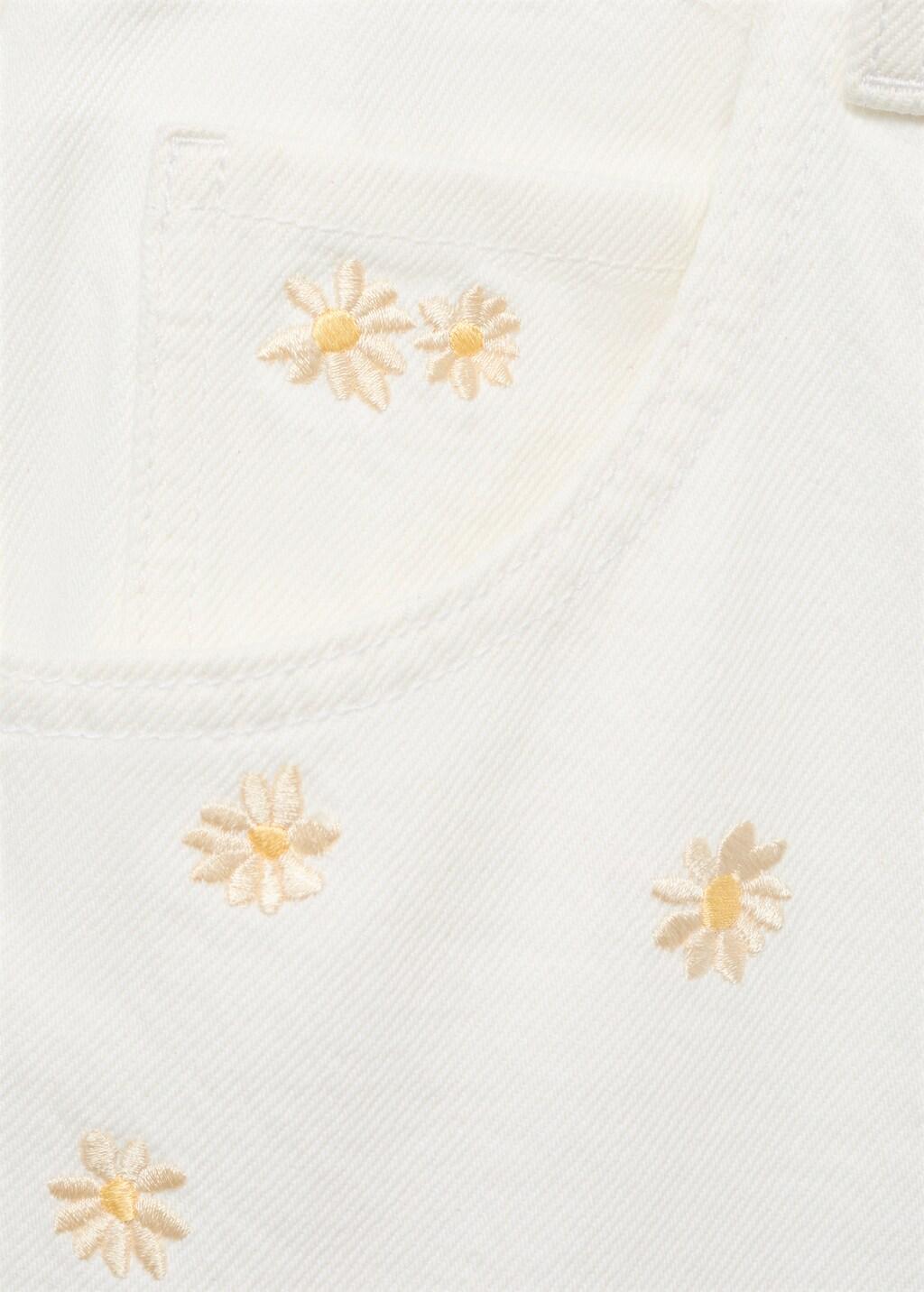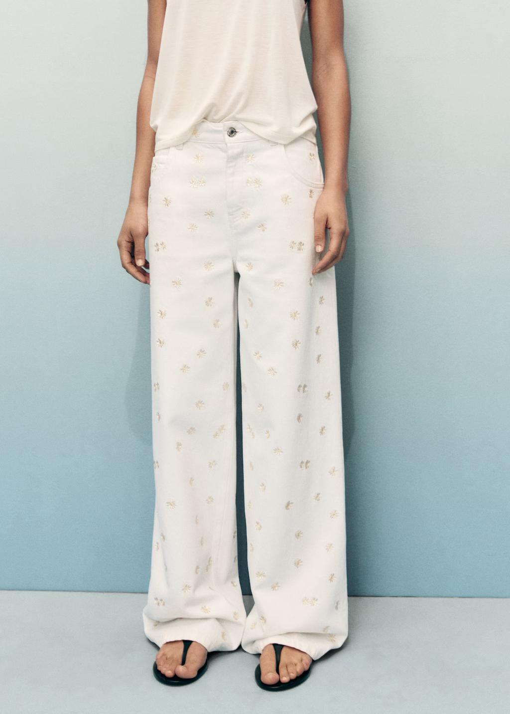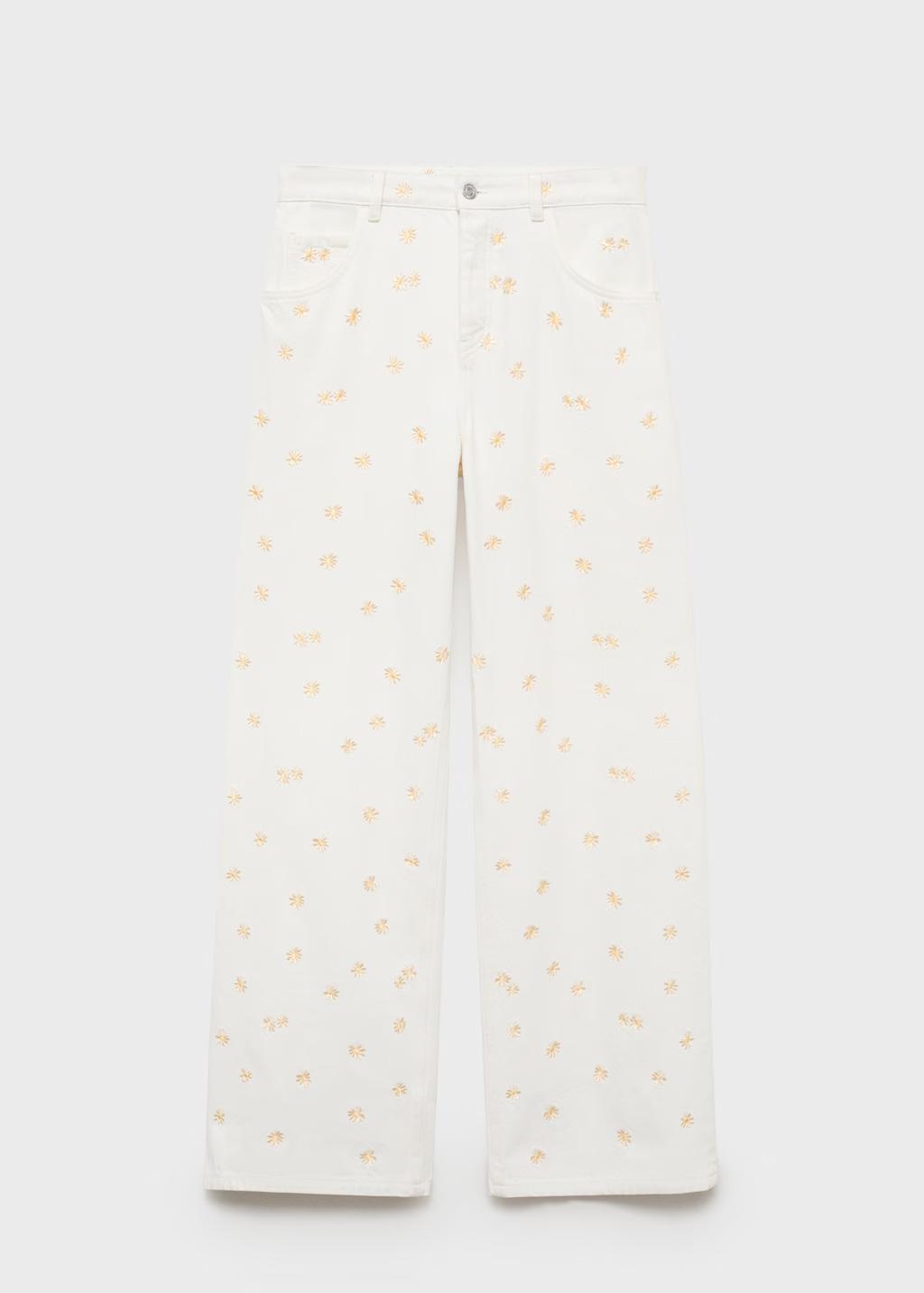 Tejido de algodón estilo tejano vaquero. Diseño largo. Diseño wideleg. Bordado de flores. Bordado de margaritas. Tiro medio. Trabillas. Cinco bolsillos. Cierre delantero con botones