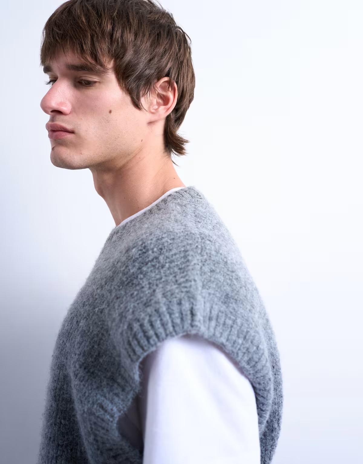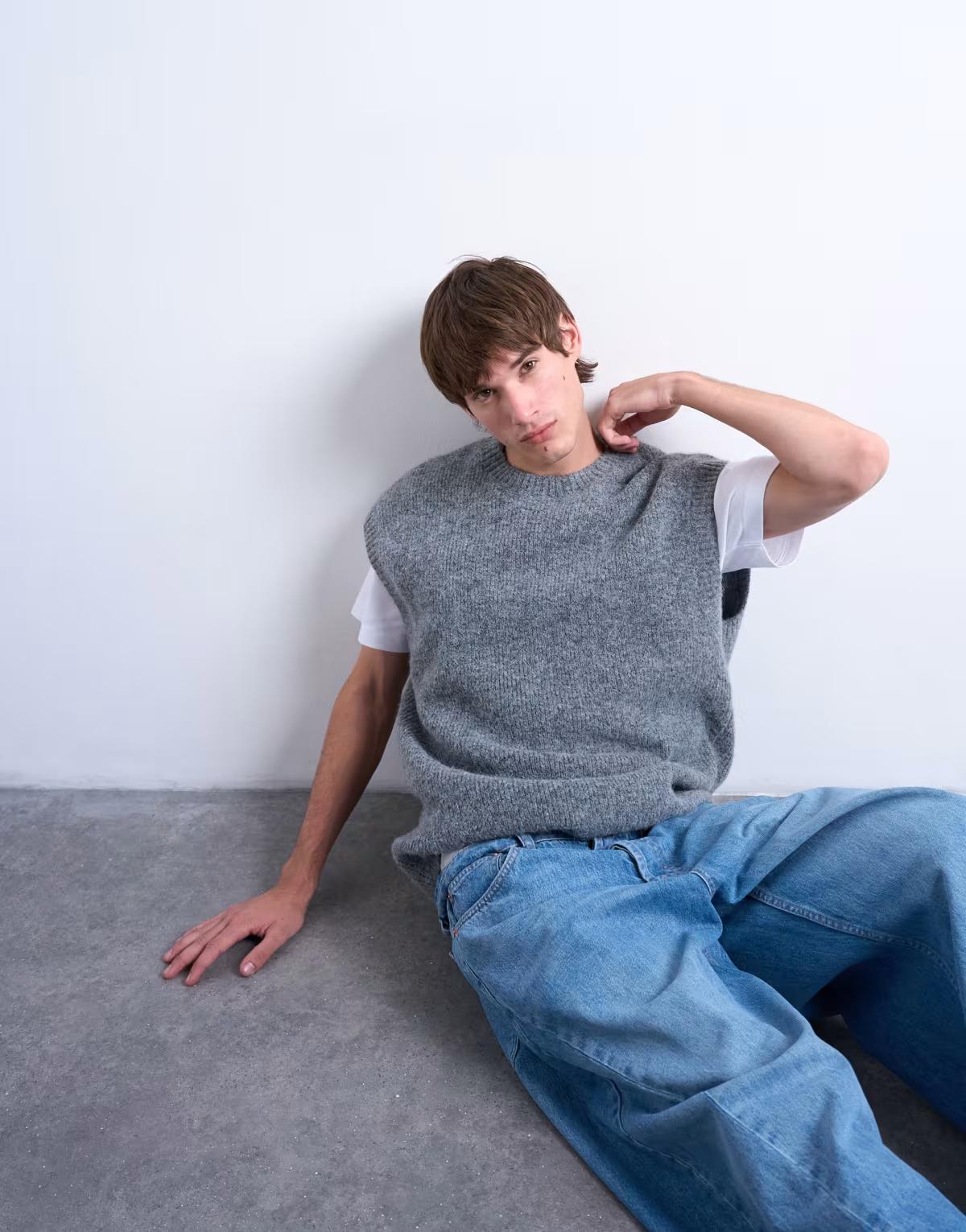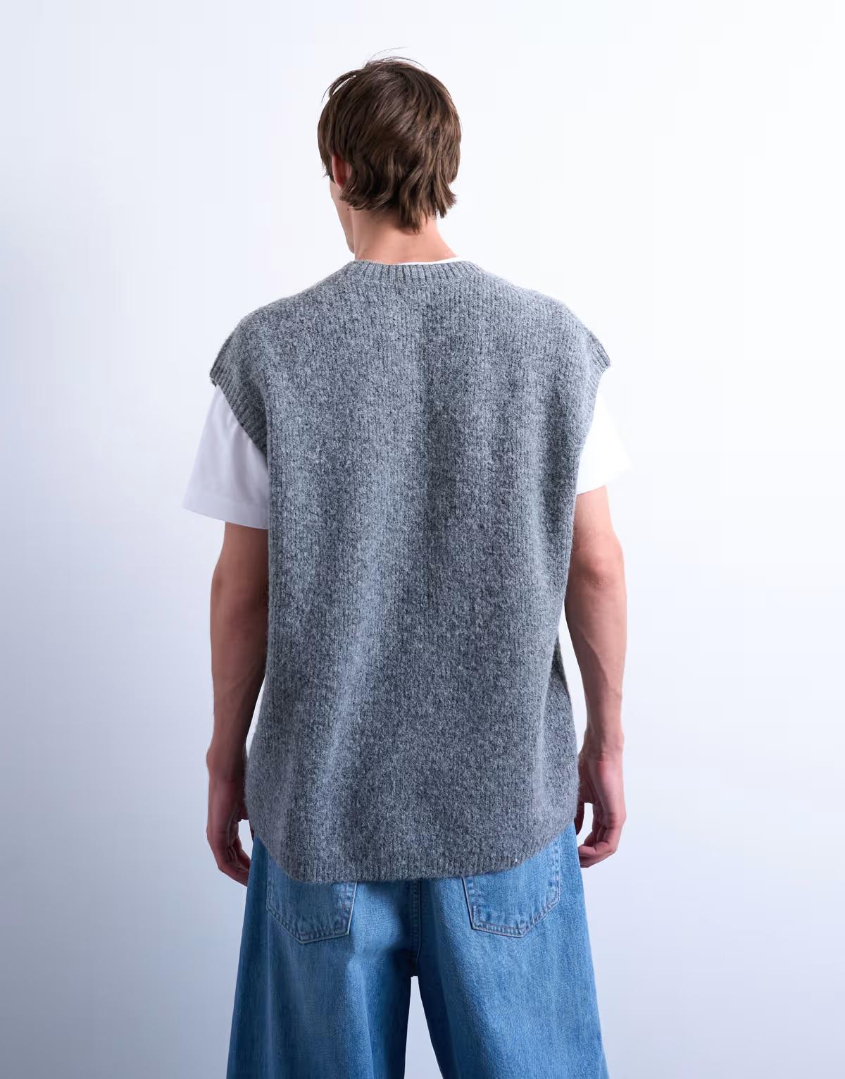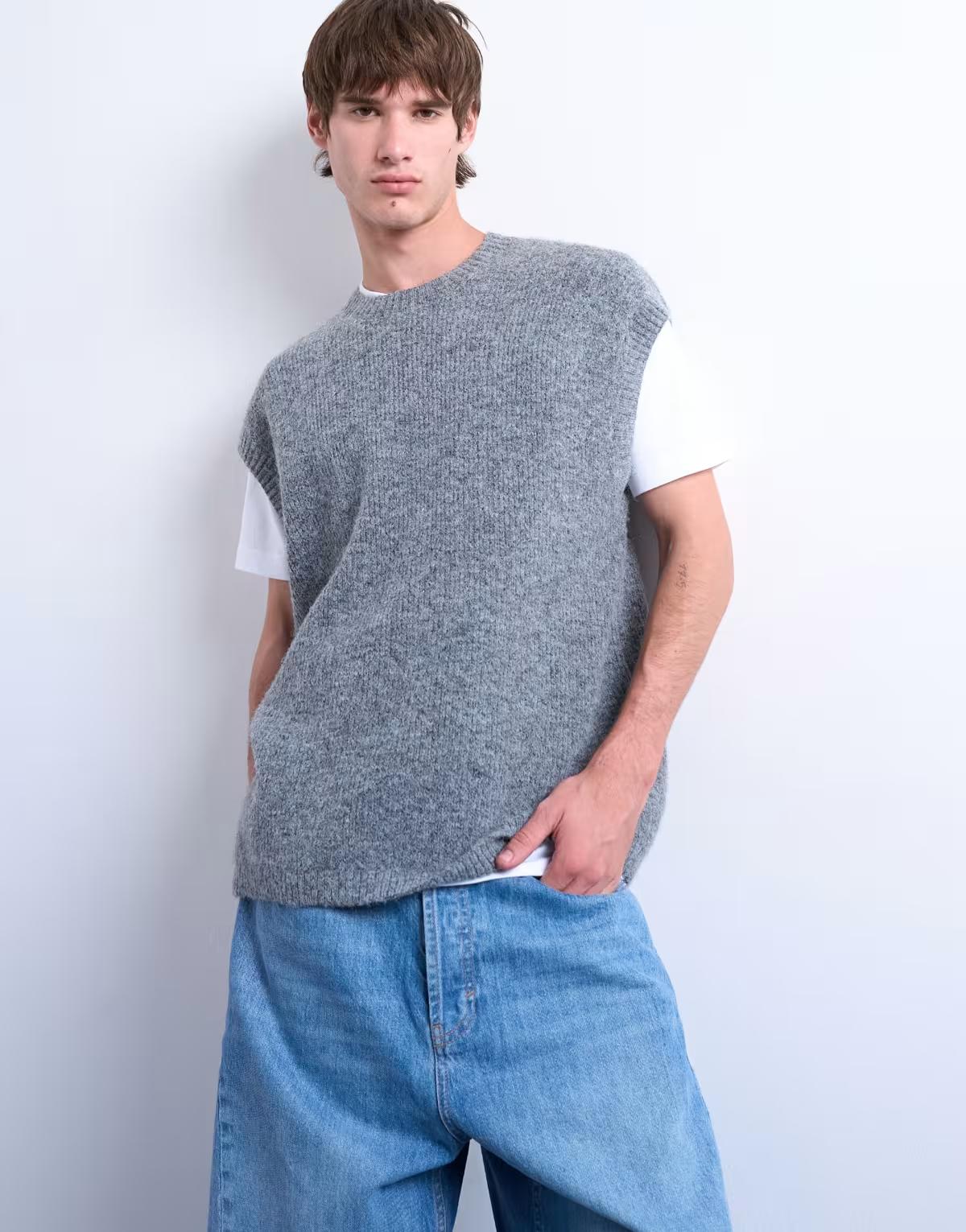 This vest is crafted from a mid-weight knit. This sleeveless design features a crew neck, ribbed trims and is cut with an oversized fit.