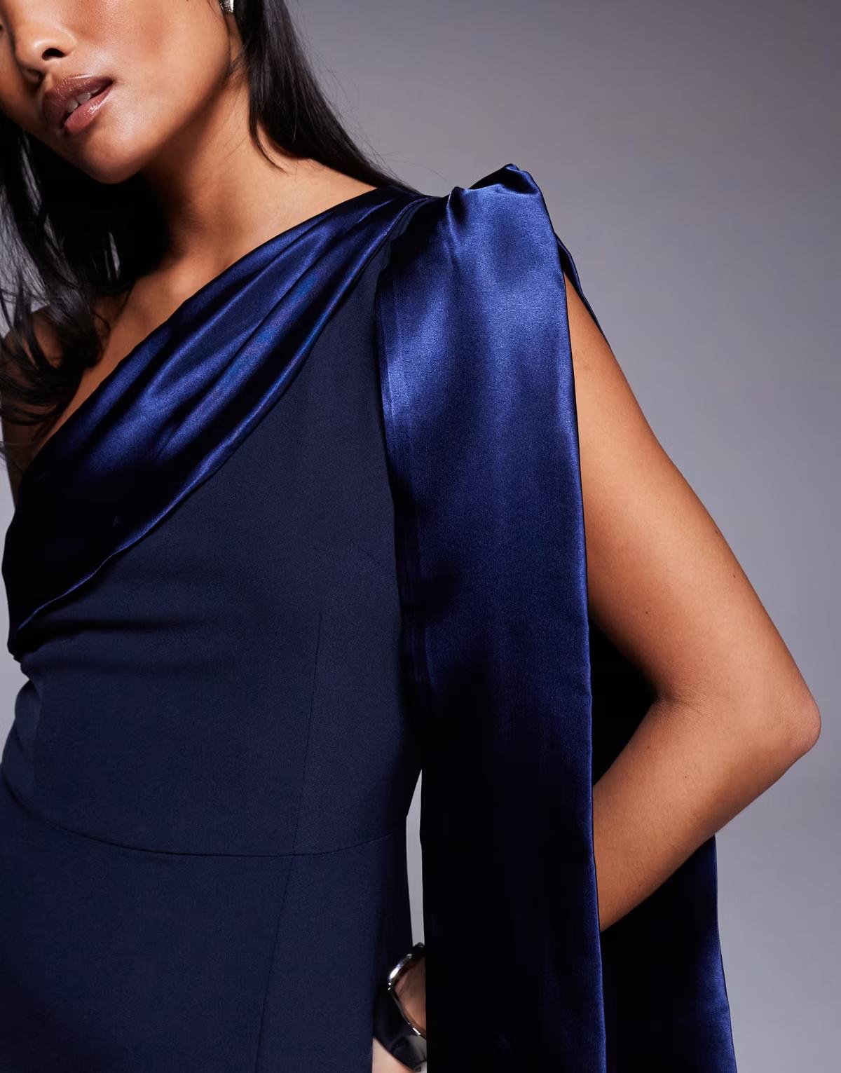 Vesper Petite One shoulder maxi dress with satin contrast in navy