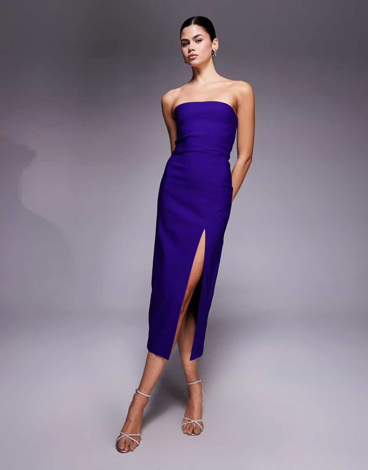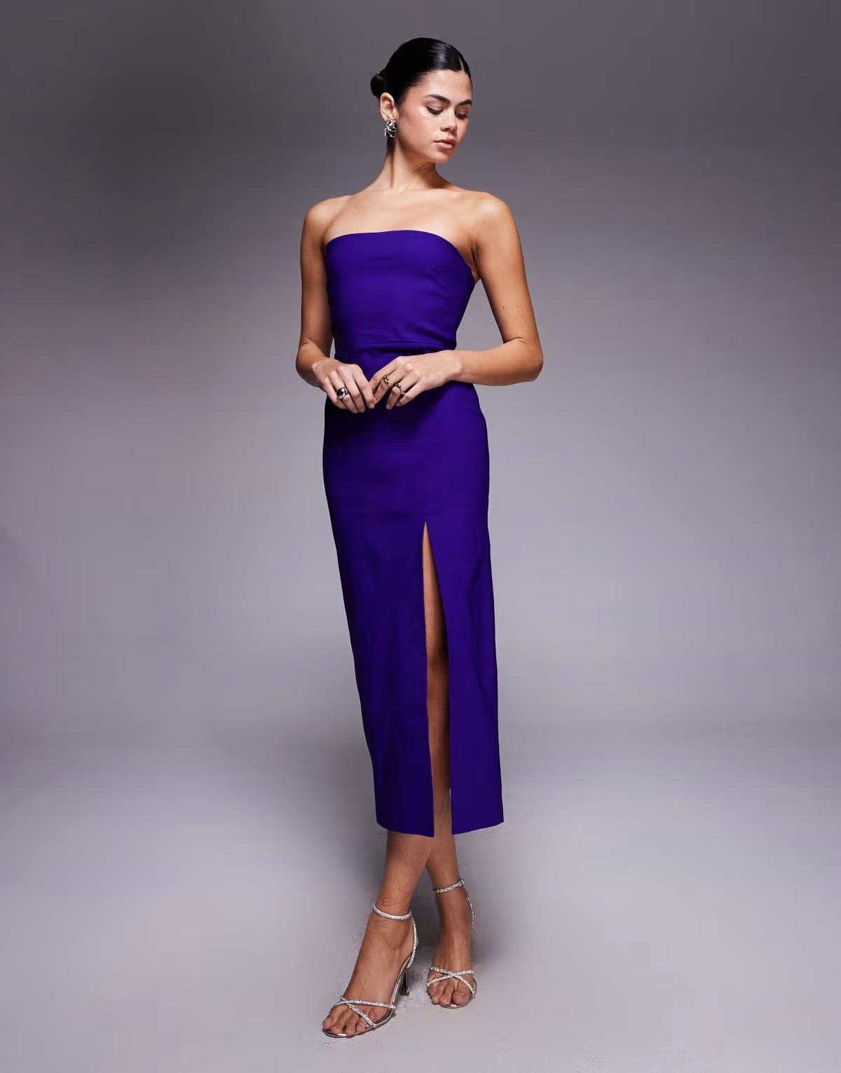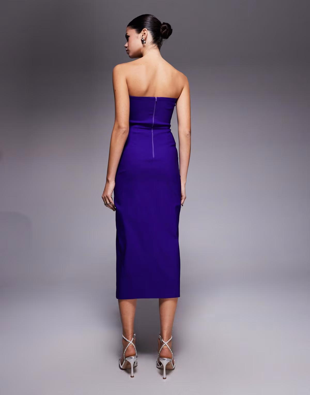 Vesper Strapless bodycon midaxi dress with thigh split in purple