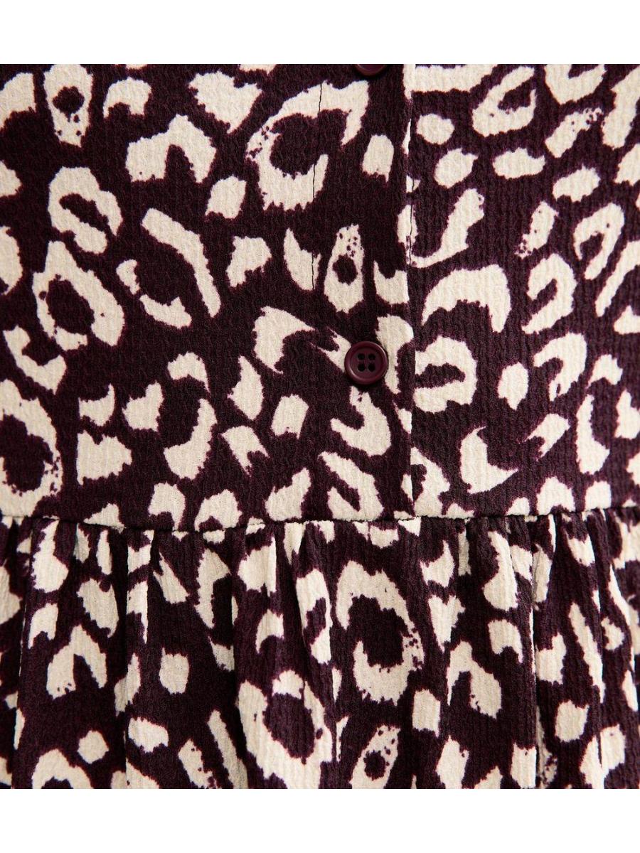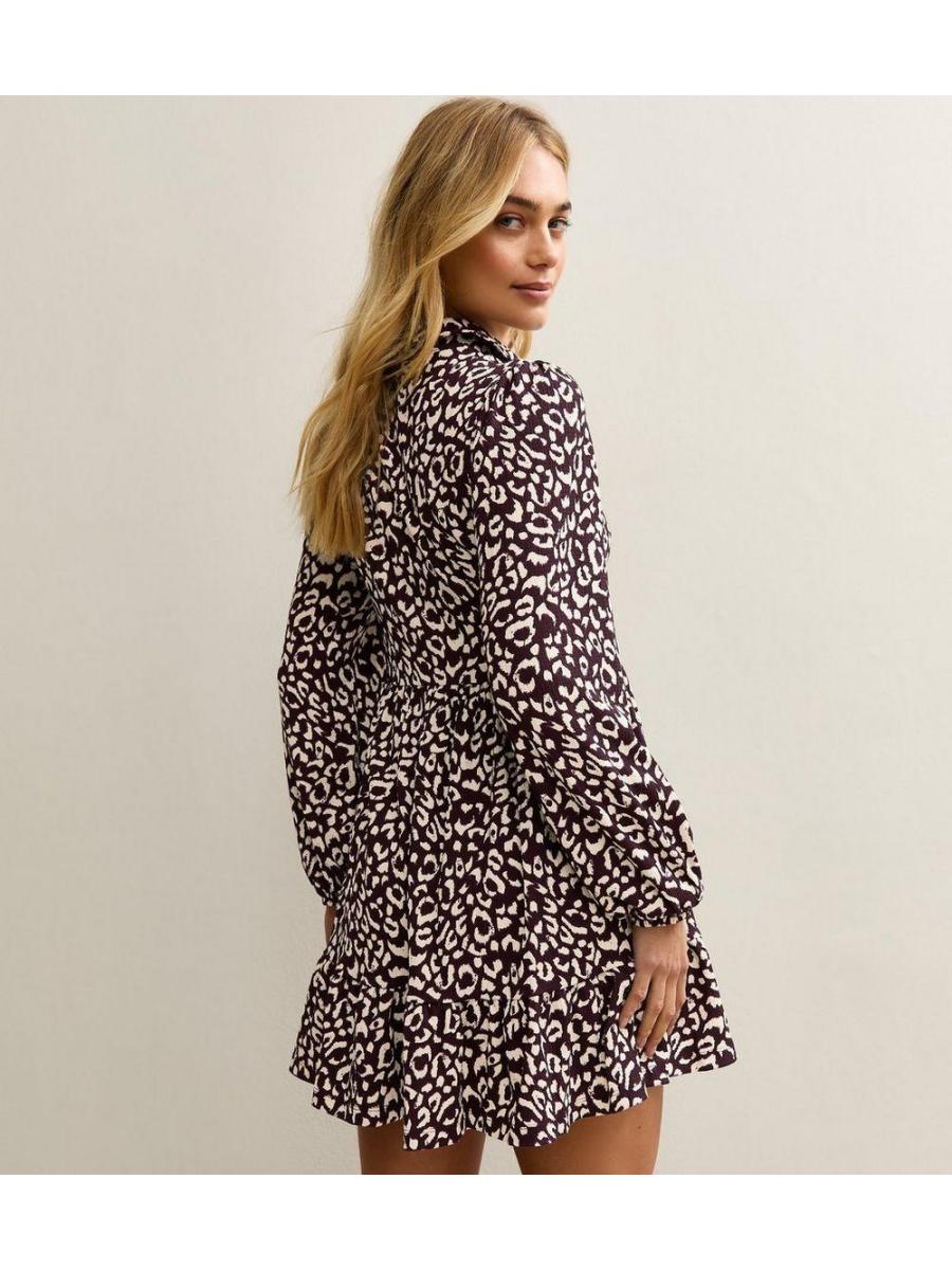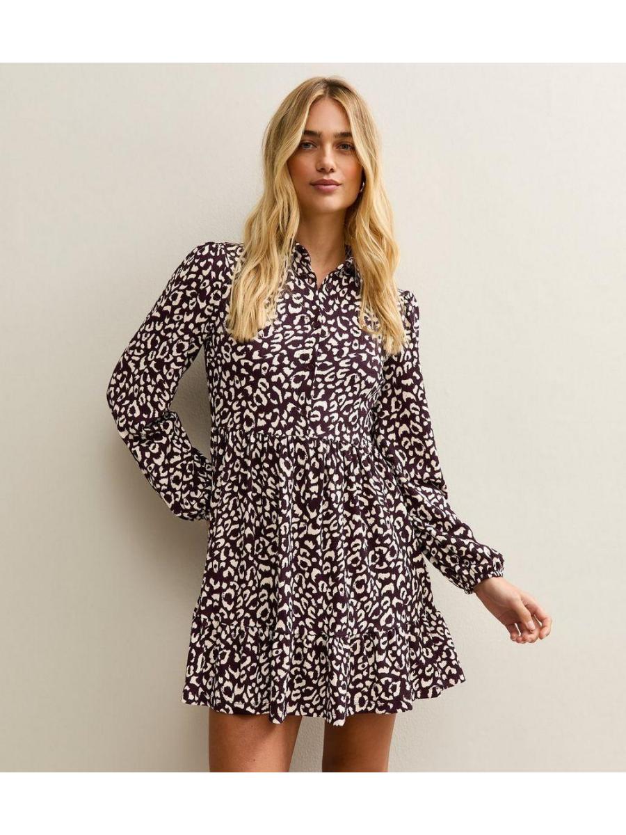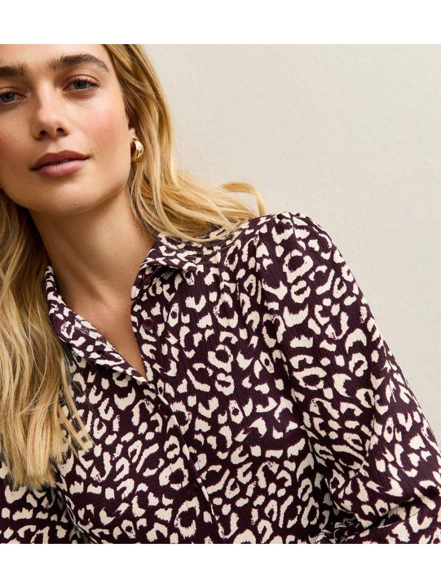 Burgundy Animal Print Long Sleeve Shirt Mini Dress