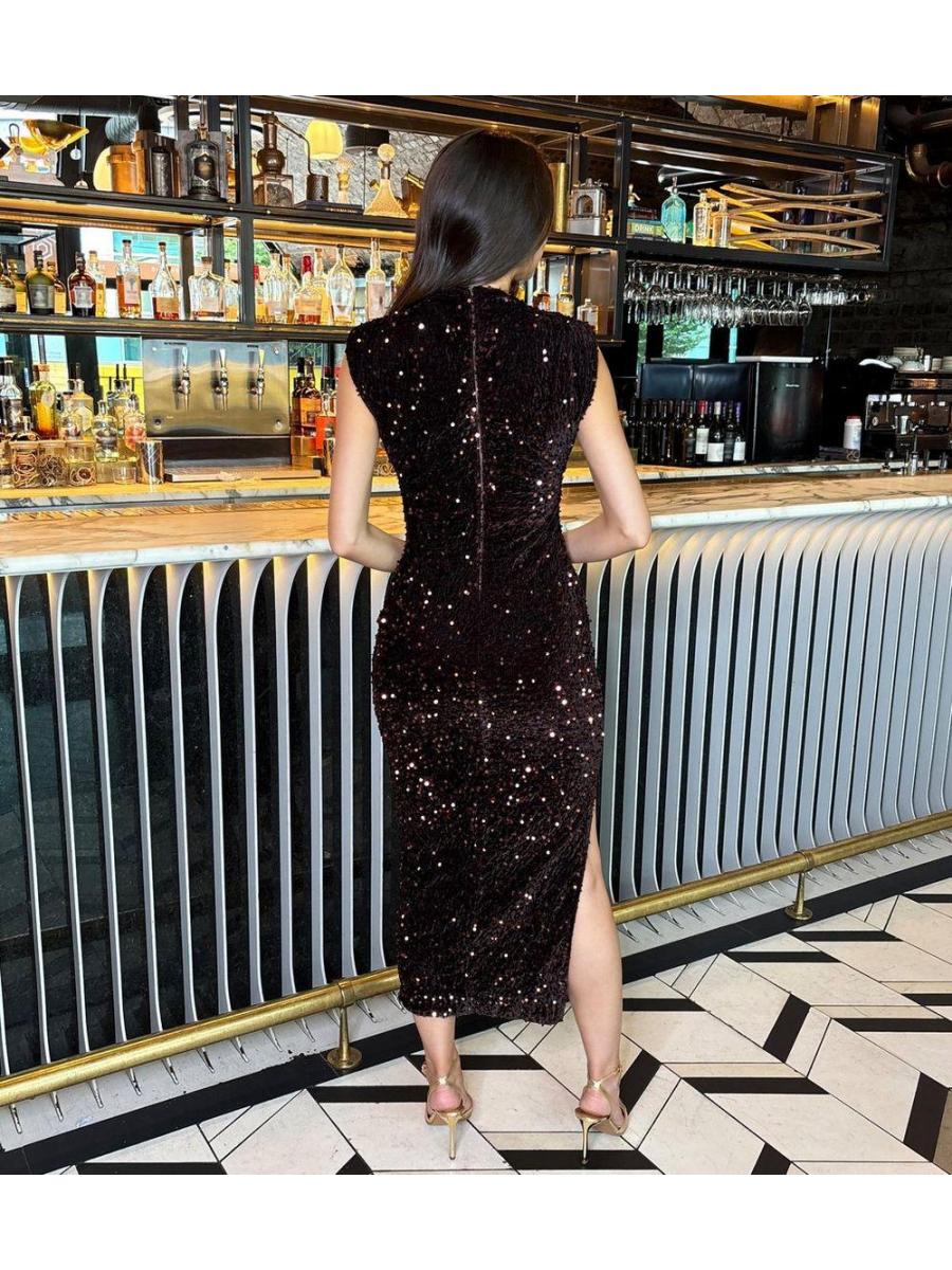 AX Paris Dark Brown Sequin Embellished Round Neck Midi Dress